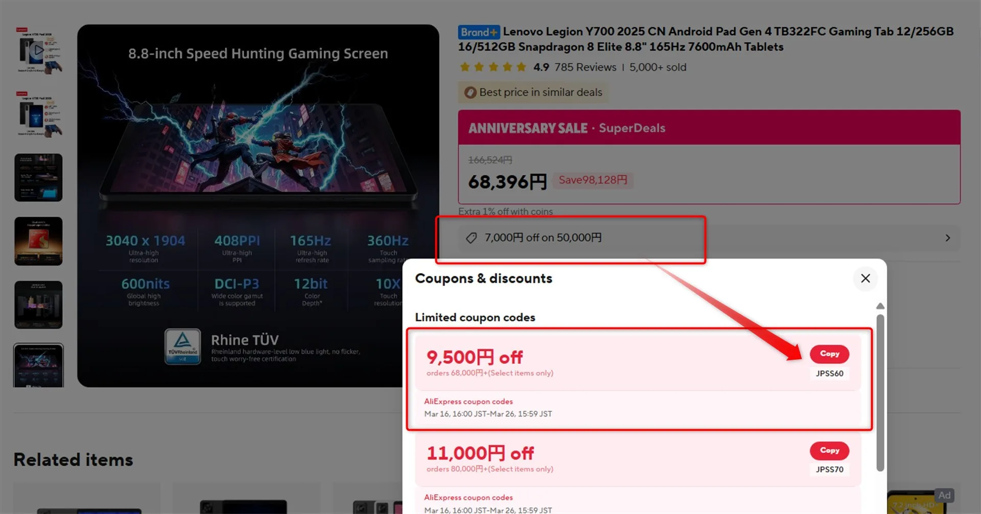 小型ゲーミングタブレットの最高峰、Lenovo LEGION Y700 Gen4が、AliExpressの16周年記念セールで、9500円オフクーポンがでており、大幅に割安になります。