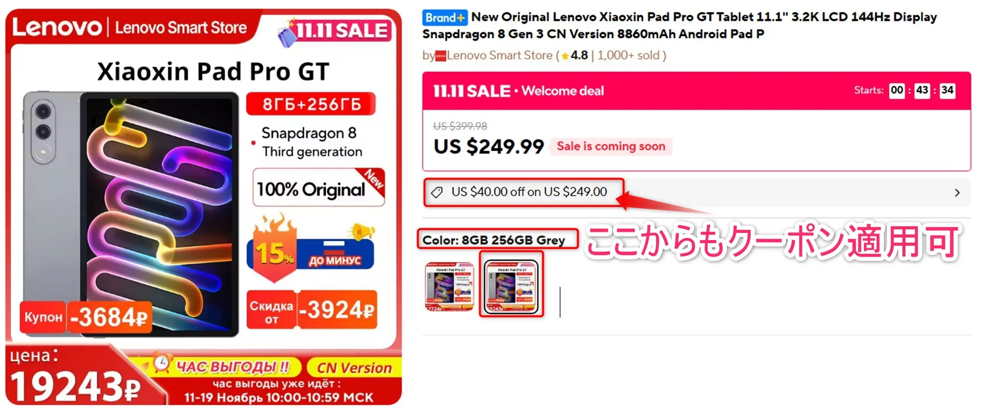 Lenovoの超人気、Snapdragon8 Gen3搭載11.1インチタブレットLenovo Xiaoxin Pad Pro GT が、AliExpress11.11独身日セールと、クーポンで割引となり、200ドルちょいの価格で買えてしまいます。