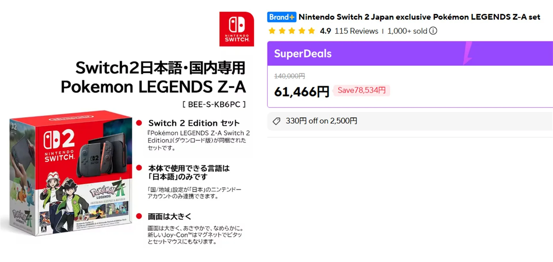 日本専用 任天堂SWITCH2 ポケモンレジェンズ Z-Aセットは61,466円。
