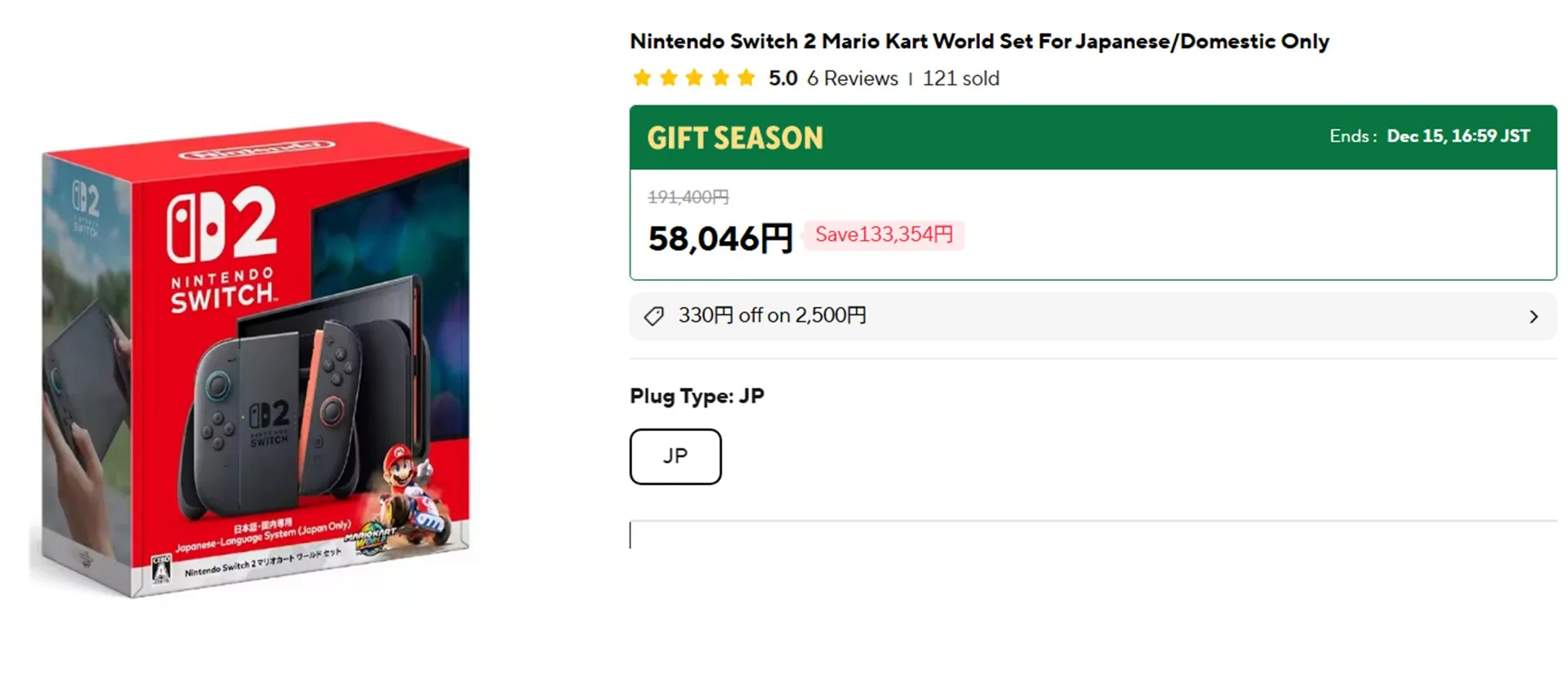 日本専用 任天堂SWITCH2 マリオカートワールドセットも発売中。価格は58,046円。