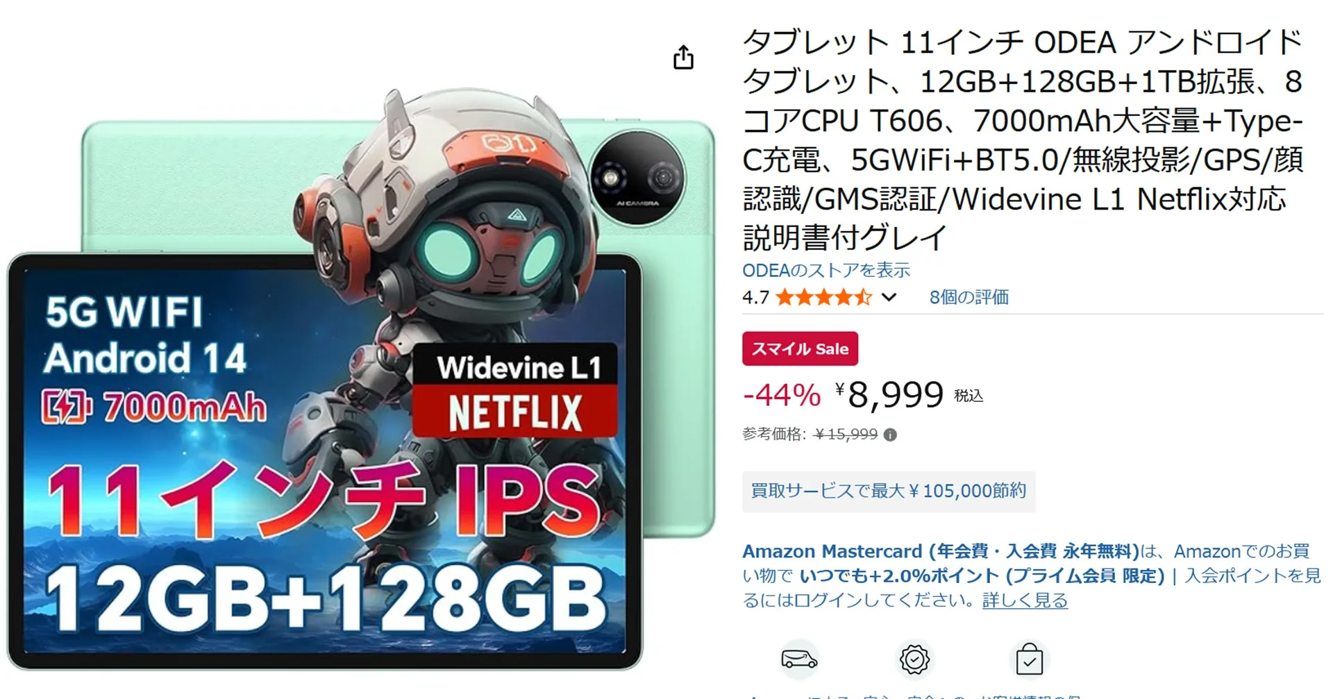 ODEA A11は、Amazonで発売中で、通常15,999円ですが、キャンペーン価格として8,999円となっています。