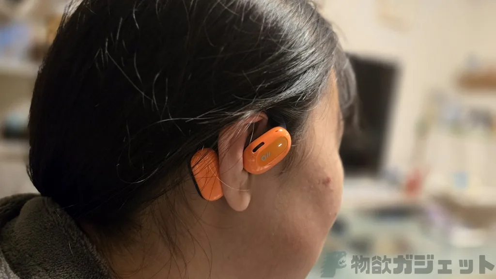 オープンイヤー型で耳に掛けて使うだけなので、装着感は軽く圧迫感はほぼありません。