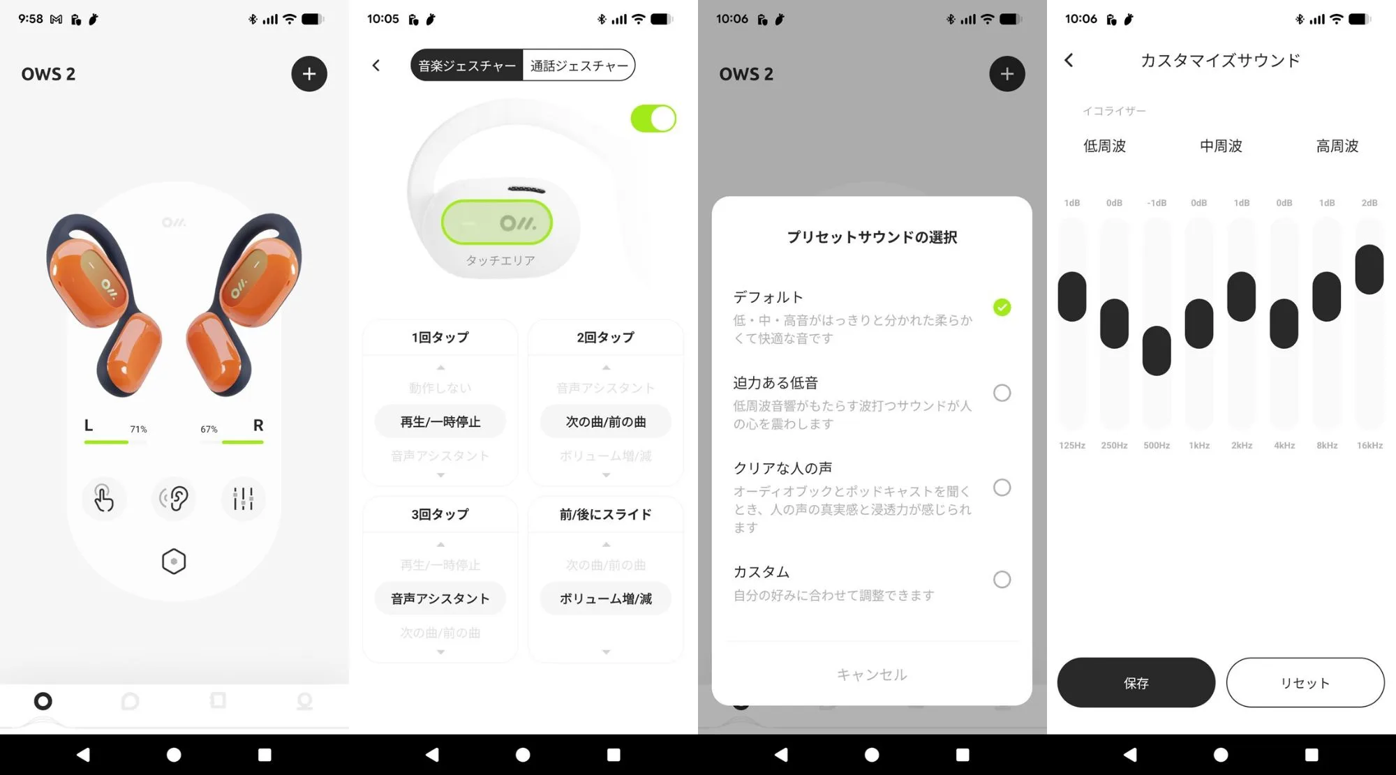 プリセットは3種類あり、デフォルト、迫力のある低音、クリアな人の声、カスタムから選択可能。