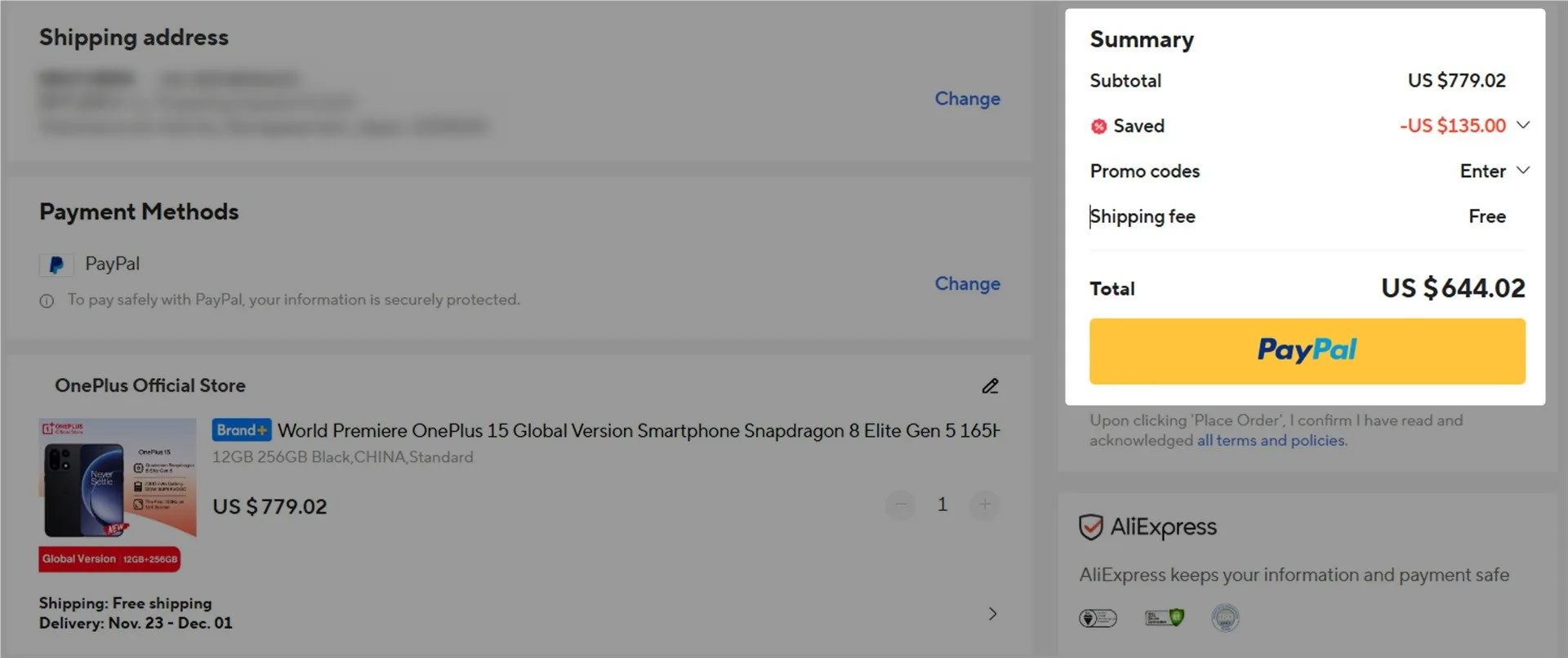 OnePlus 15グローバルバージョンは、12GB+256GB構成で、779.02ドル(約122,000円)でセール中。
