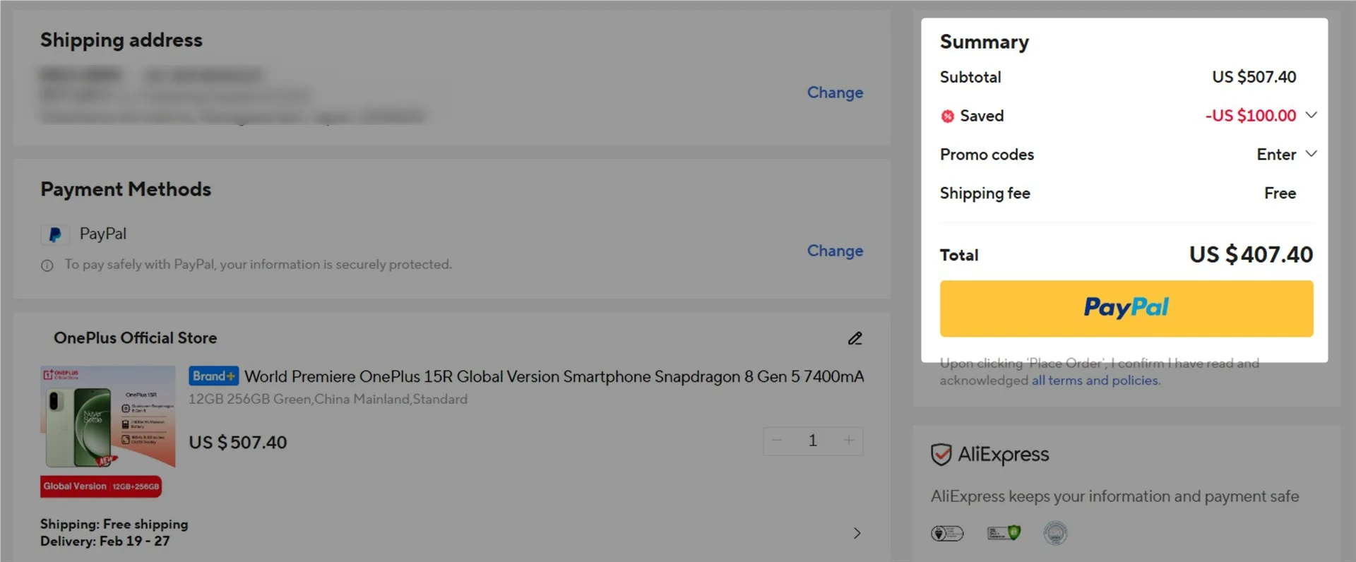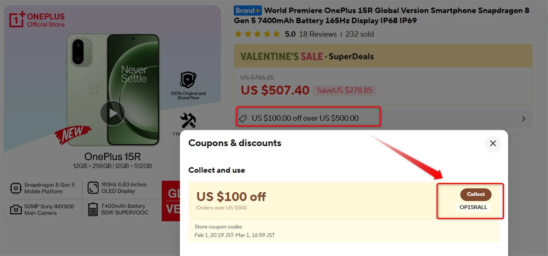 OnePlus 15R 12GB+256GB (グリーン)の価格は、AliExpressセールで507.40ドル(約78000円)。