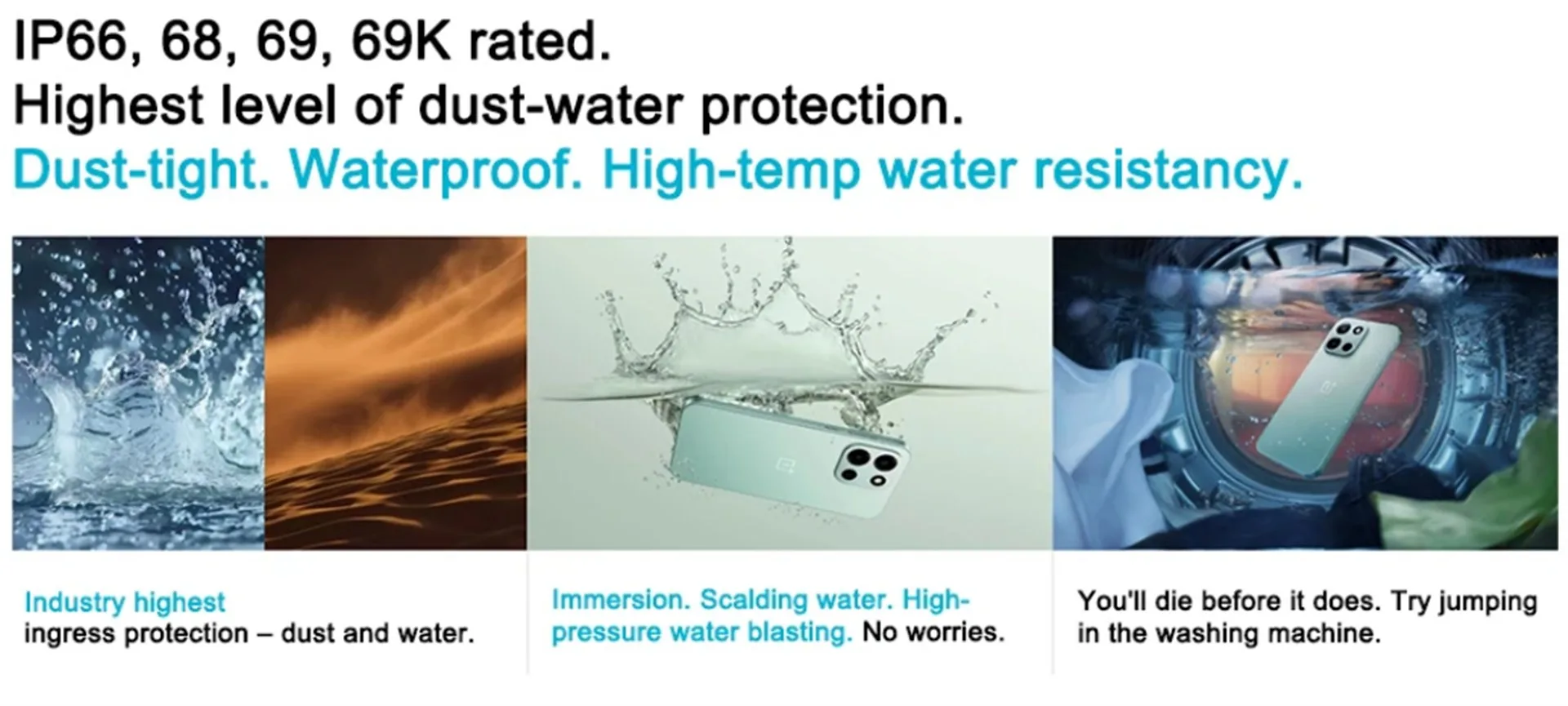 普通のスマートフォン以上に凄いのが、IP69K防水防塵に対応している点で、水中使用はもとより高圧の水でも浸水しない最高レベルの耐水性能です。