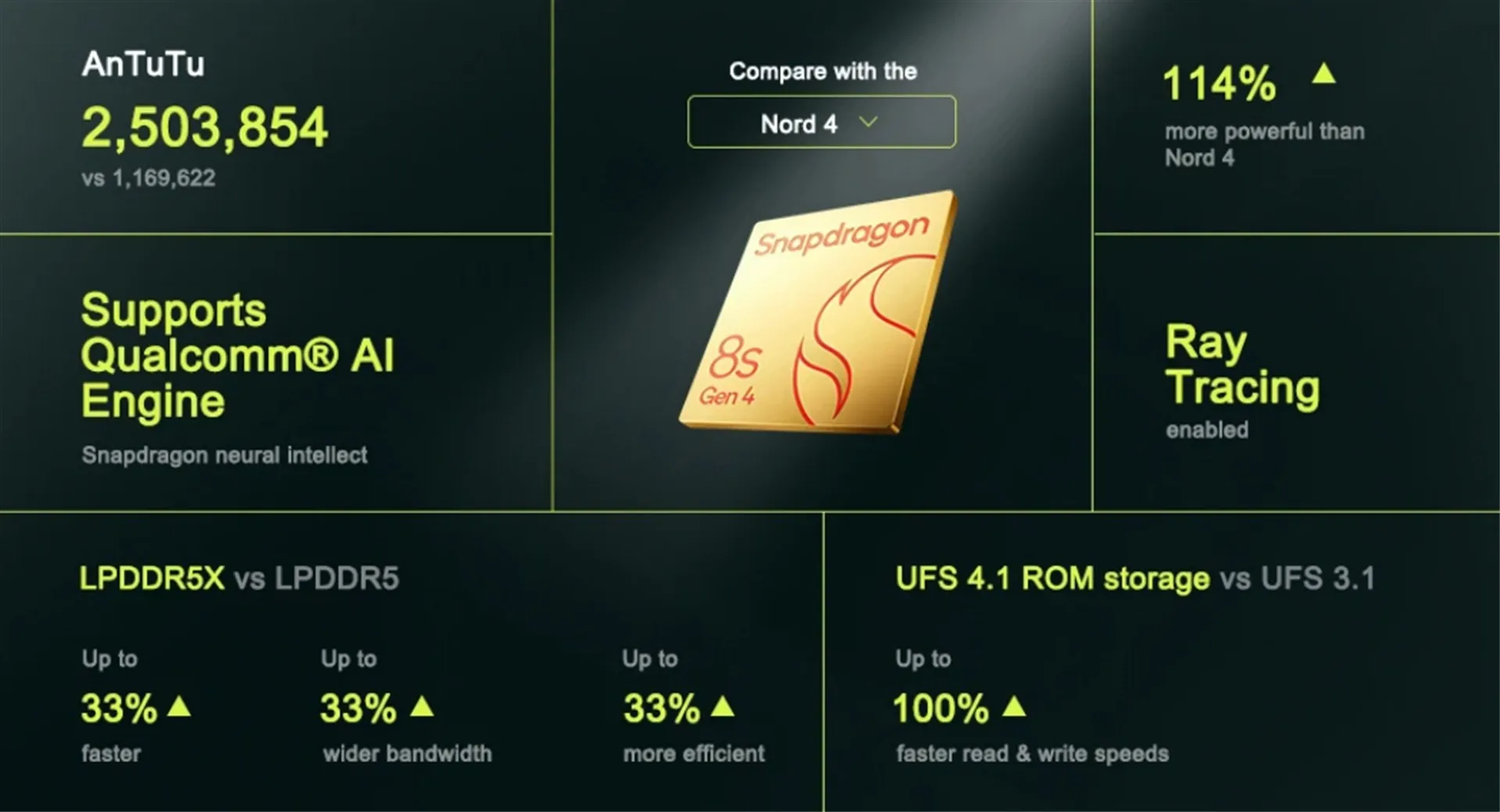 今回は、Snapdragon 8s Gen 4を搭載し、AnTuTu v11 ベンチマークスコアは250万点あたりとより強力に。