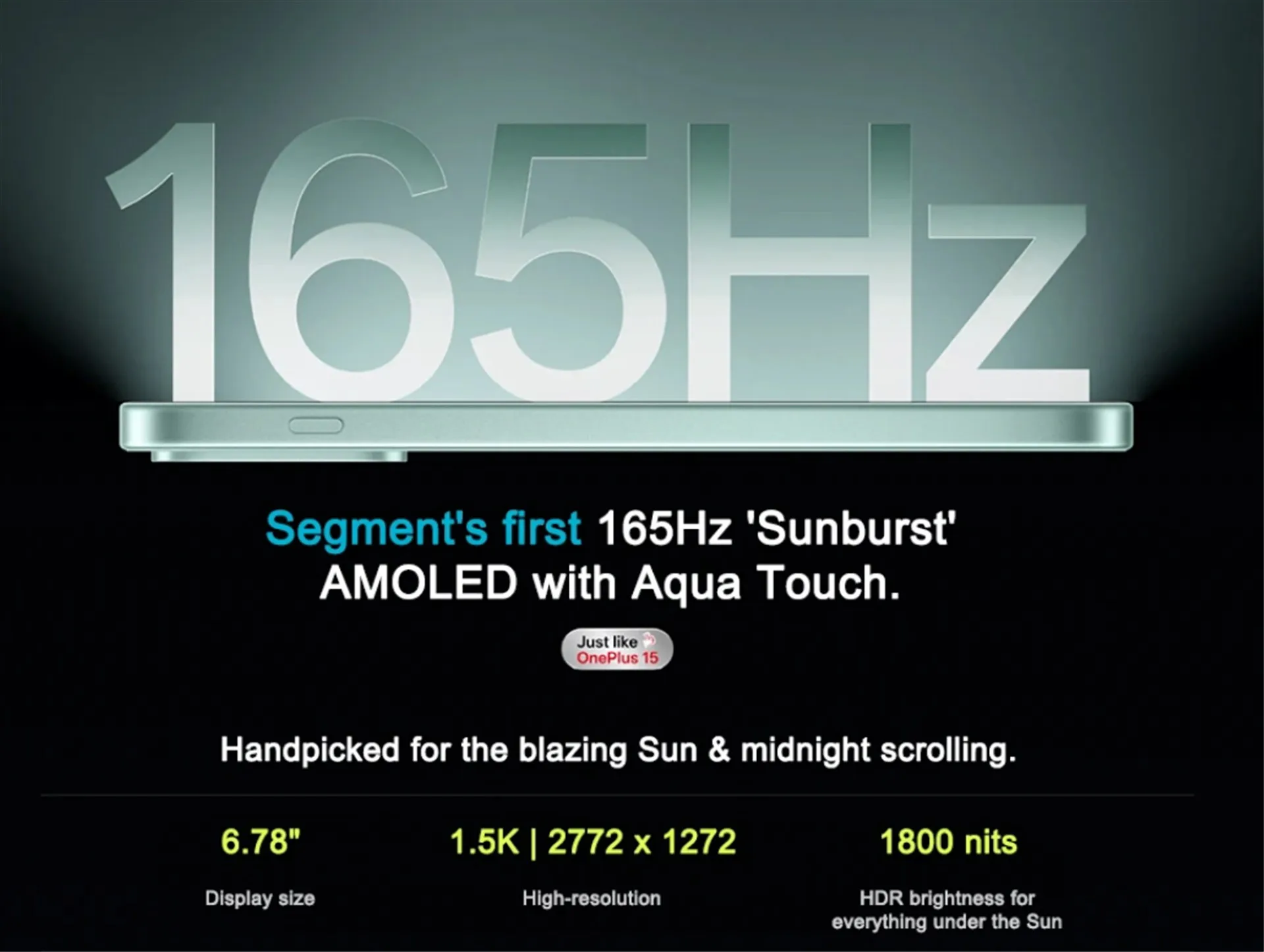 解像度1.5K(2772 x 1272)の6.78インチ Sunburst AMOLED(有機EL)ディスプレイを搭載しています。リフレッシュレートはNord 5の最大144Hzから向上し、最大165Hzに対応しました。