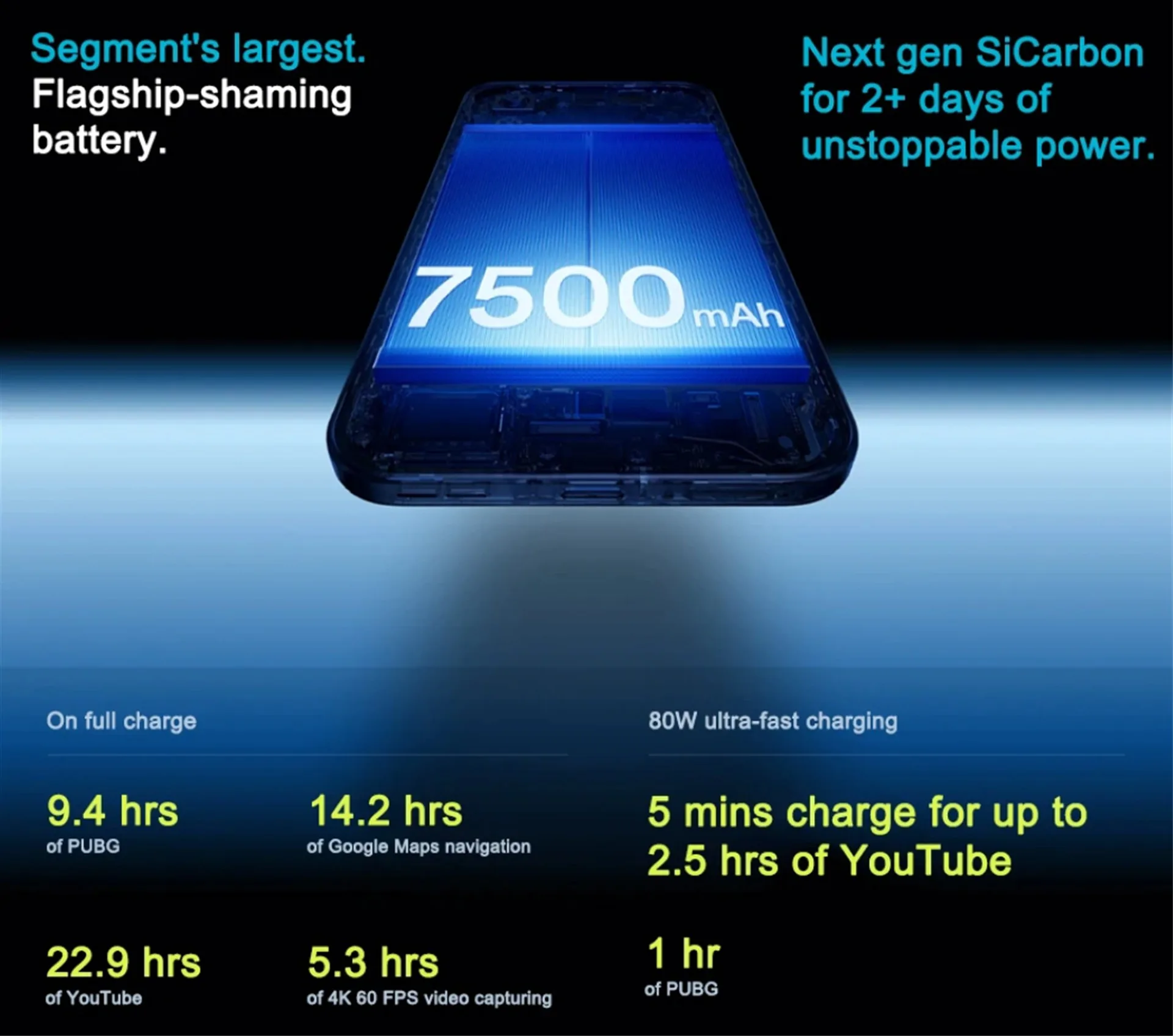 7,500mAhの超大容量バッテリーを搭載しています。Nord 5のバッテリー容量(6800mAh)から大幅に増加。