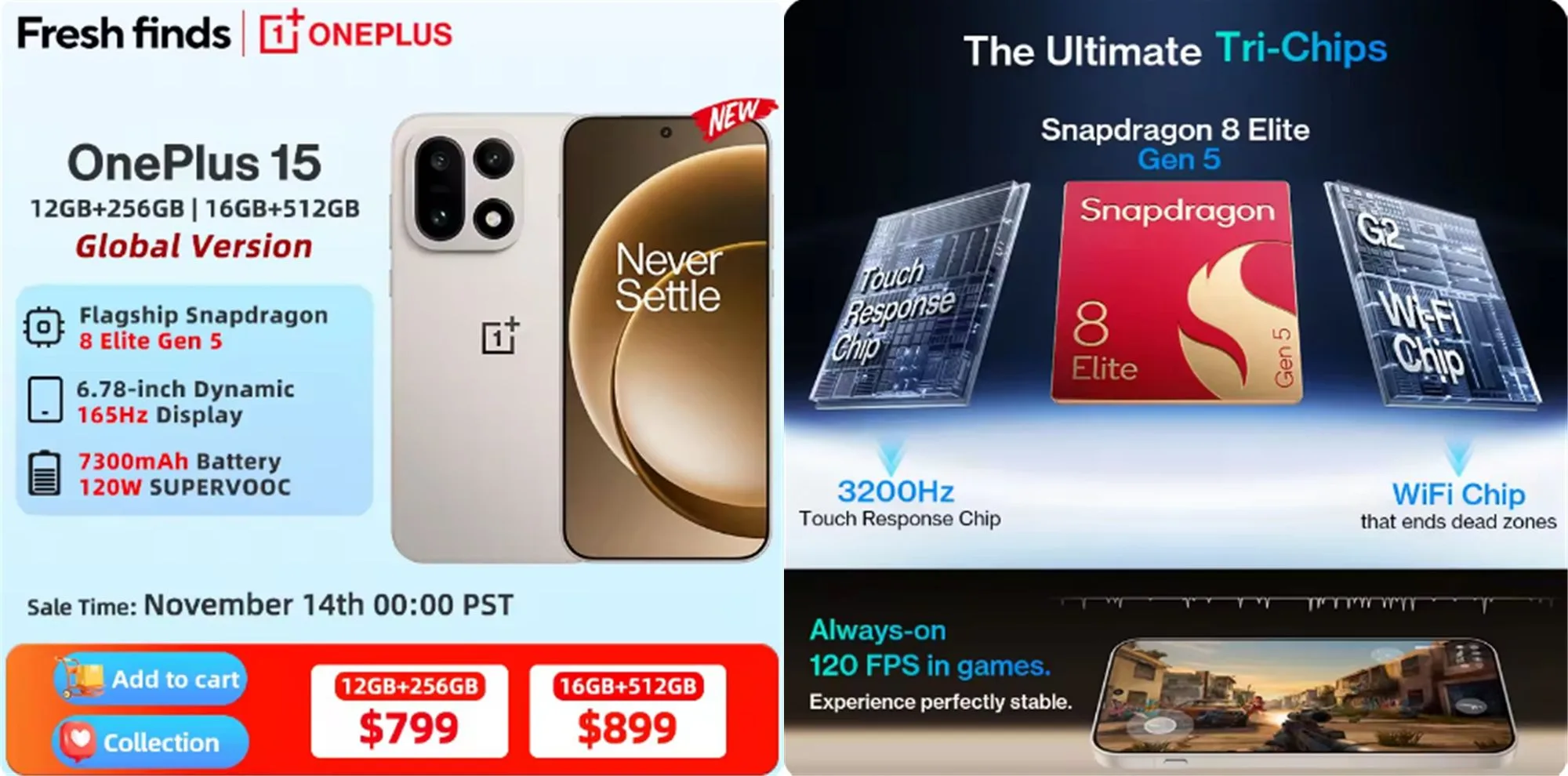 OnePlus 15グローバルバージョンは、12GB+256GB構成で、120W充電器(但しEU版コネクタ)が付いて829ドルでセール中。