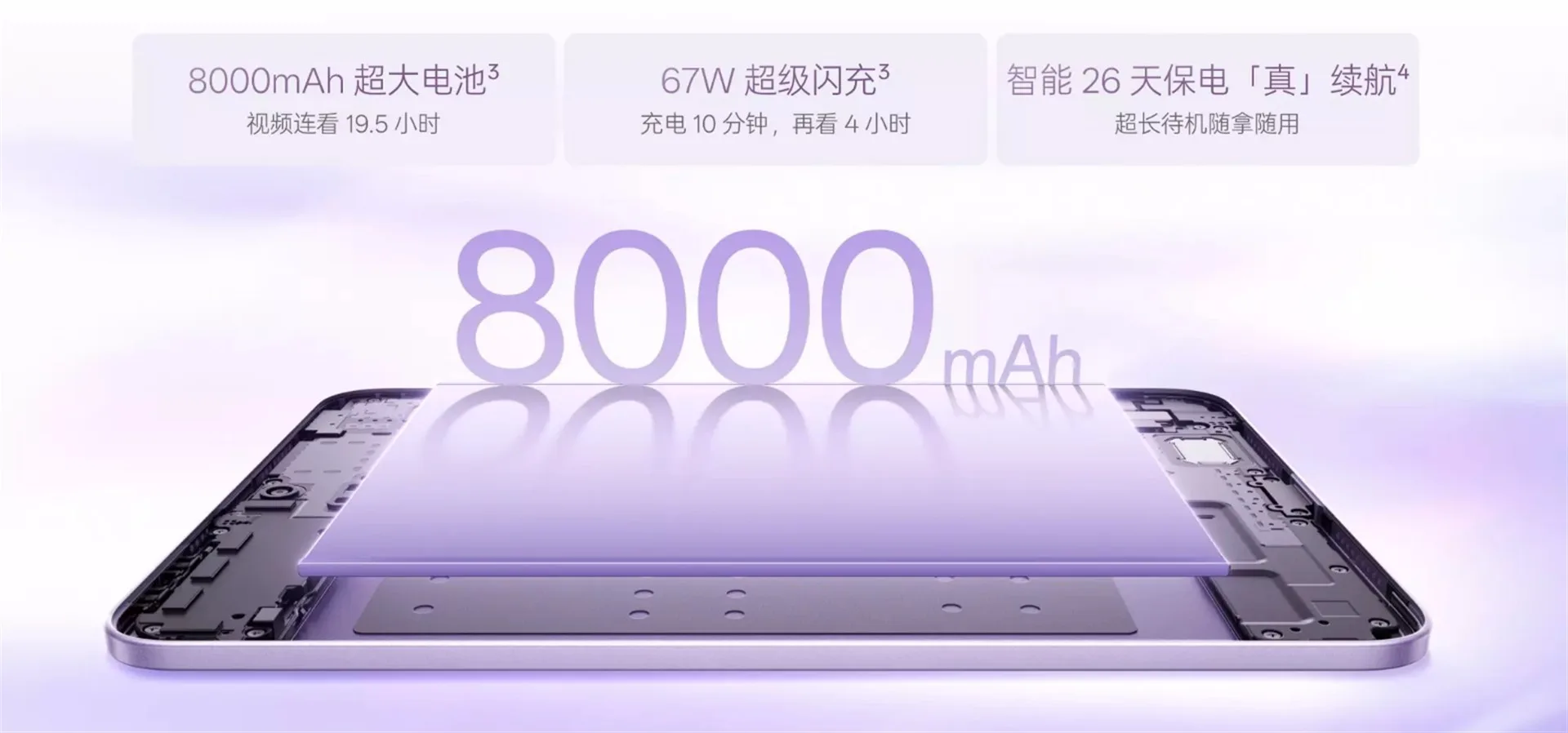 iPad mini(第6世代)の約5,000mAhと比較すると破格の容量で、充電は67WのSUPERVOOC急速充電に対応。短時間で一気にフル充電が可能です。