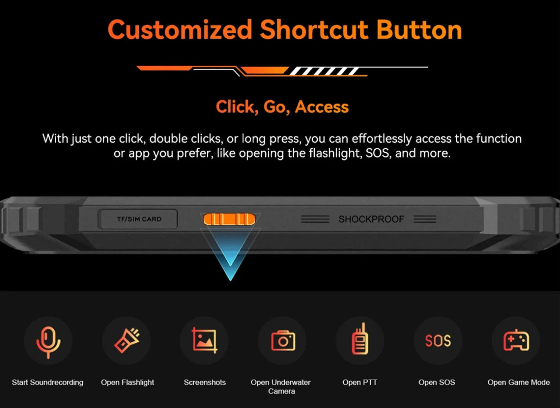 アウトドアや過酷な現場での使用を想定した、頑丈なタフネス(高耐久)デザインです。