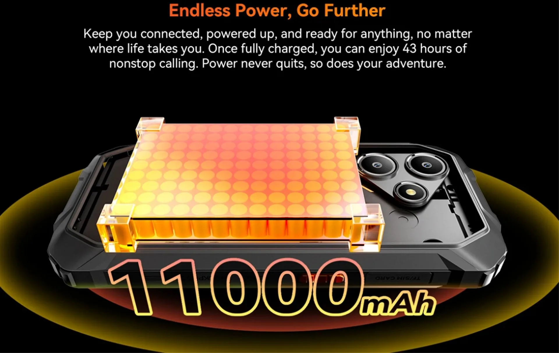 11000mAhの超大容量バッテリーを搭載しており、一般的なスマホの約3倍の大容量を搭載。