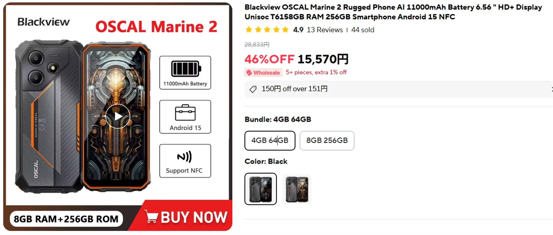 OSCAL Marine 2は4GB+64GB版は101.52ドル(15570円)、8GB+256GB版は124.72ドル(19,128円)でセール中。