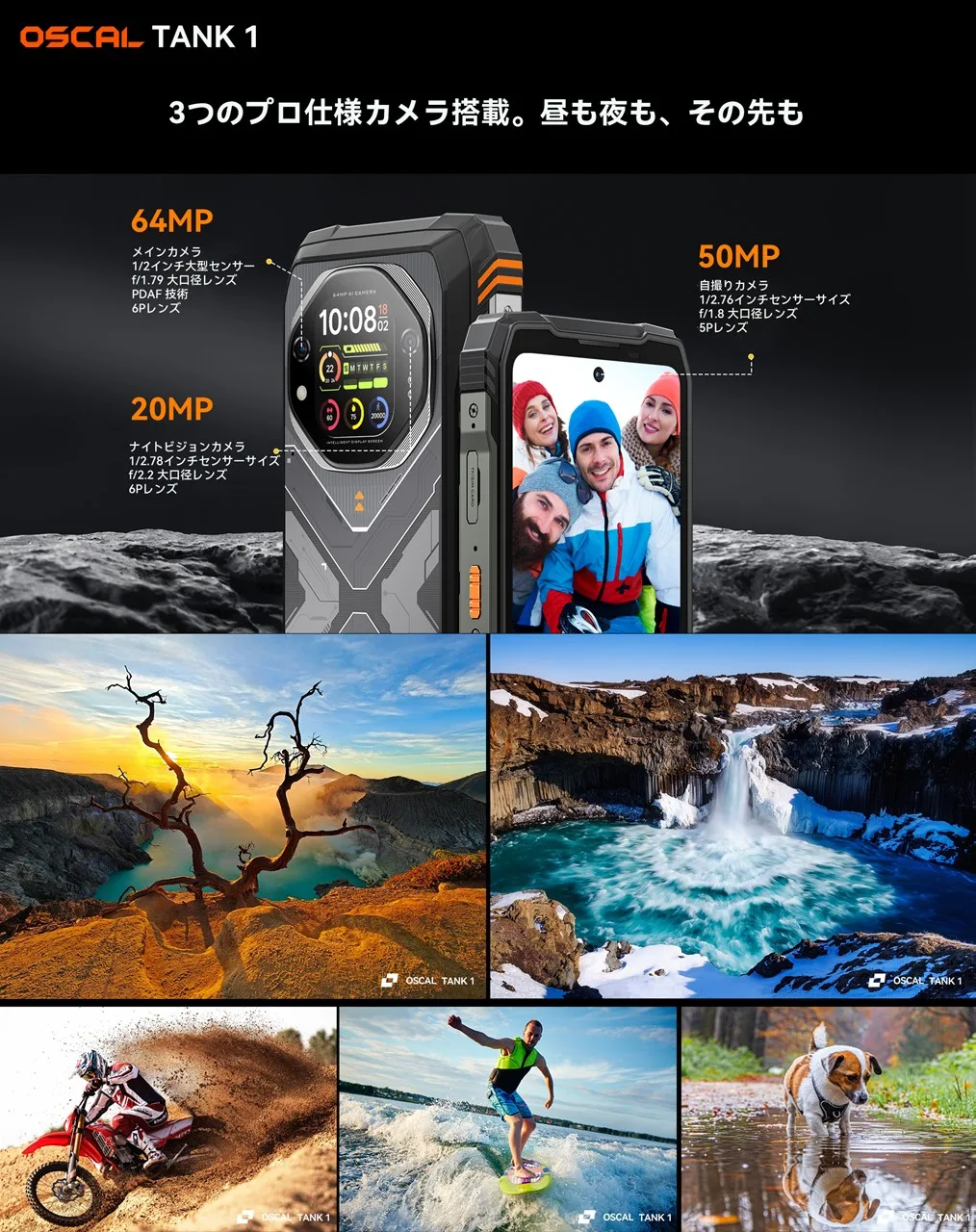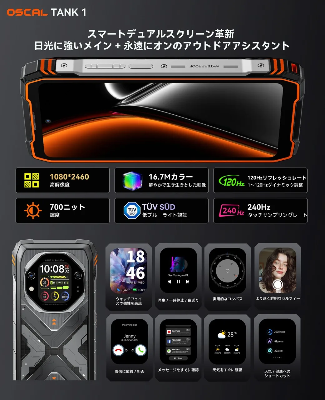OSCAL TANK1は、見た目通りの防水・防塵(IP68/IP69K)と耐衝撃(MIL-STD-810H)性能を両立させた、ごつくがっちりとしたタフネスデザイン。2mの水没、10mの落下耐性などとにかくタフ。