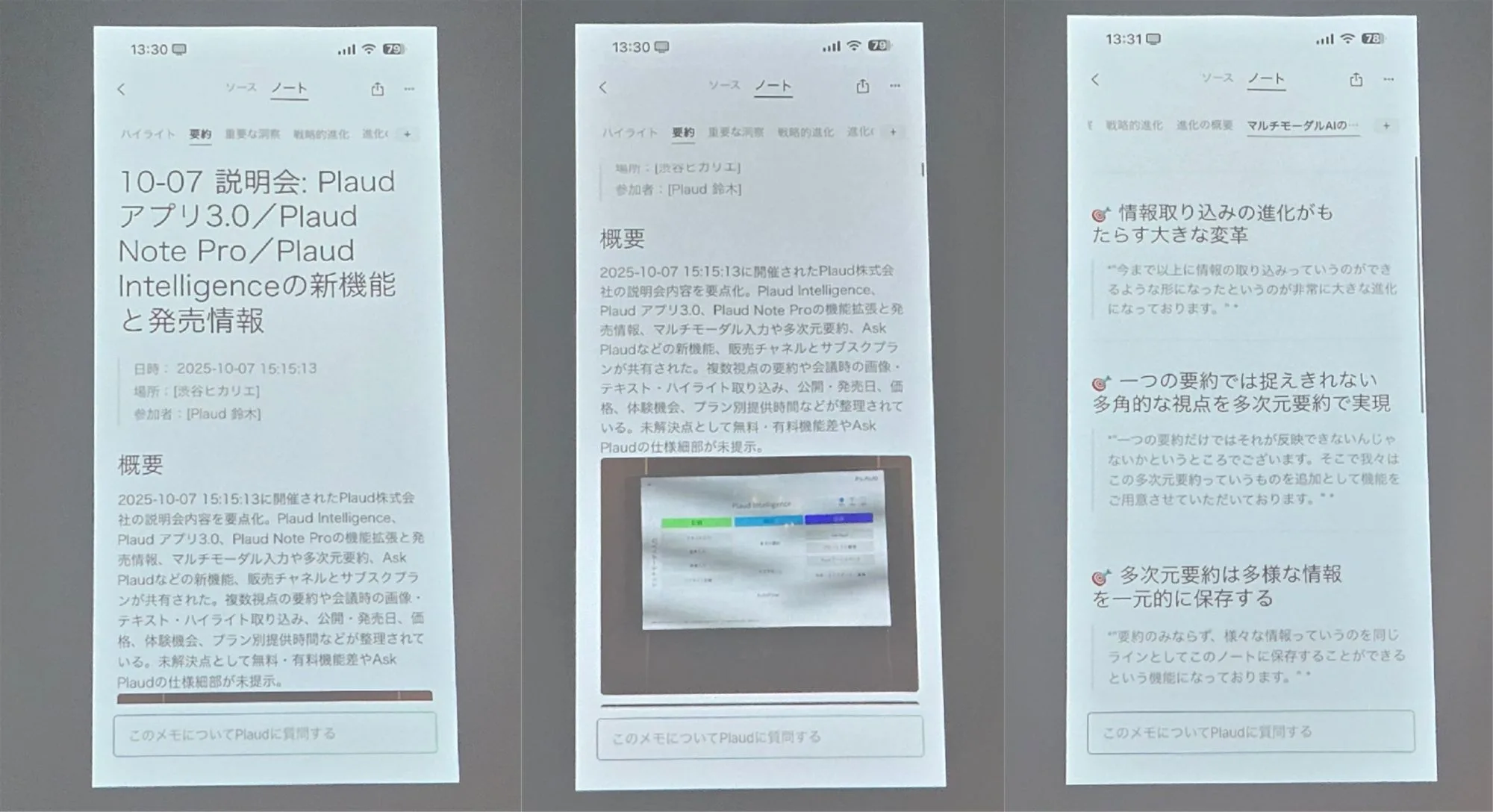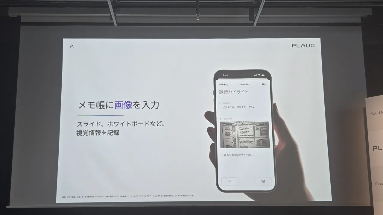 会議等で録音している際にホワイトボードなどの写真やメモを取り入れる事が可能になっています。例えばアプリの中で会議中に気になった事をメモしたり、写真を撮ると、それも会議の要約の中に取り込まれるようになります。
