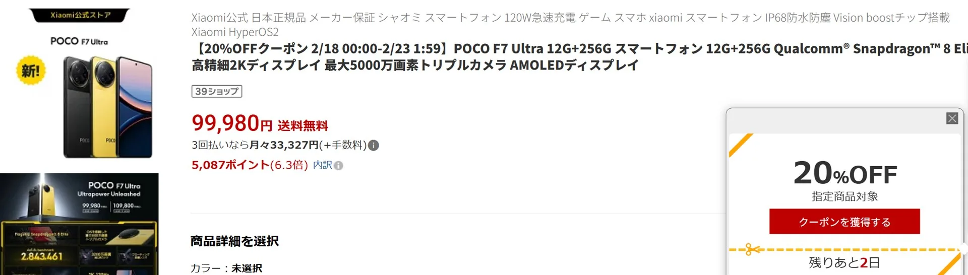 Xiaomi のPOCOブランドから発売されている、Snapdragon8 Elite搭載でAnTuTu 280万点の超ハイエンドスマートフォン「POCO F7 Ultra」が、楽天のXiaomi公式ストアで、20%オフクーポンがあり約2万円オフとなっています。