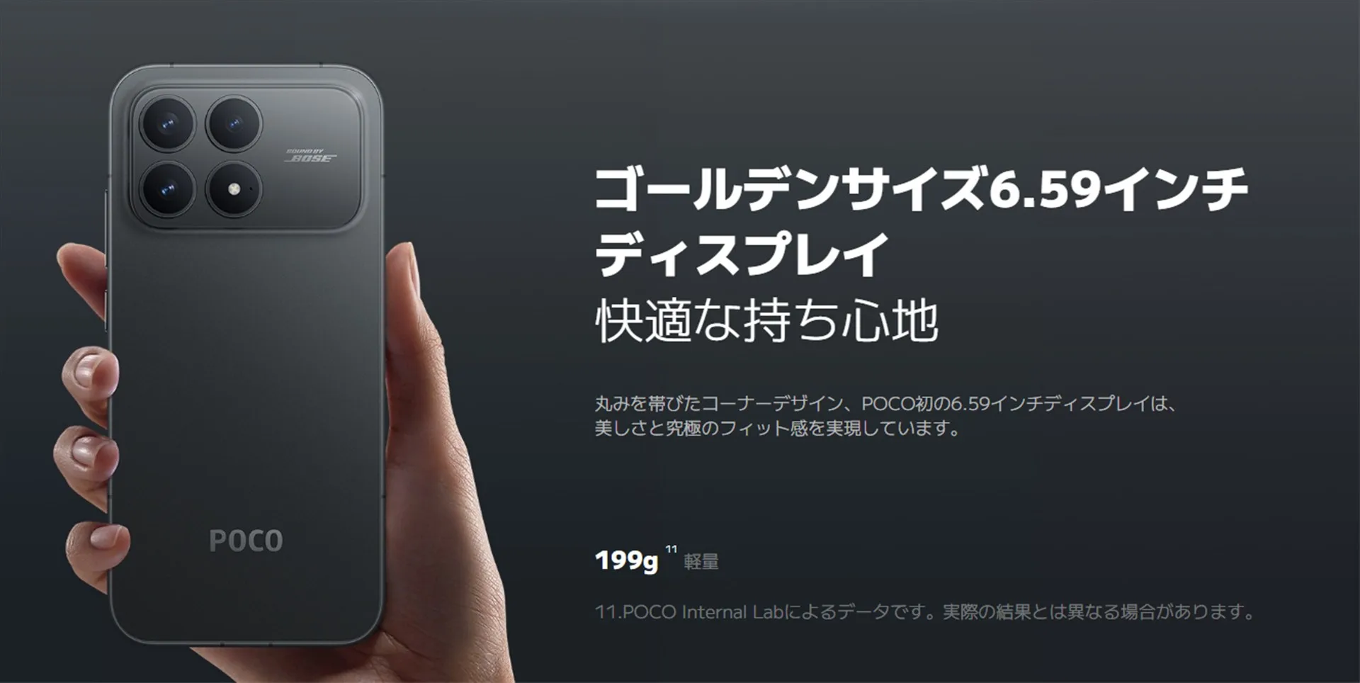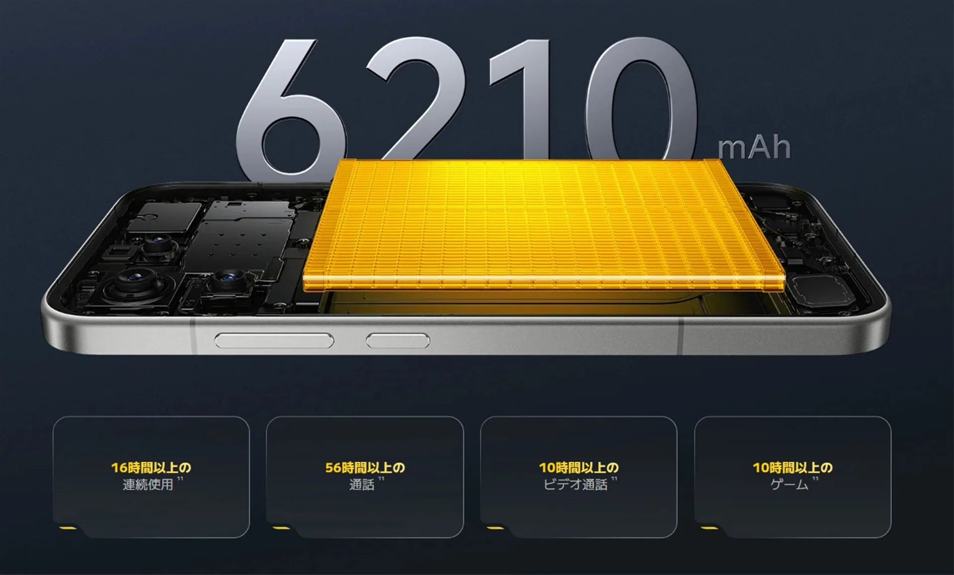POCO F8 Proは、6210mAhと一般的なスマホの1.5倍の容量を搭載しながら、厚さわずか8mm、重量199gと抑えられています。
