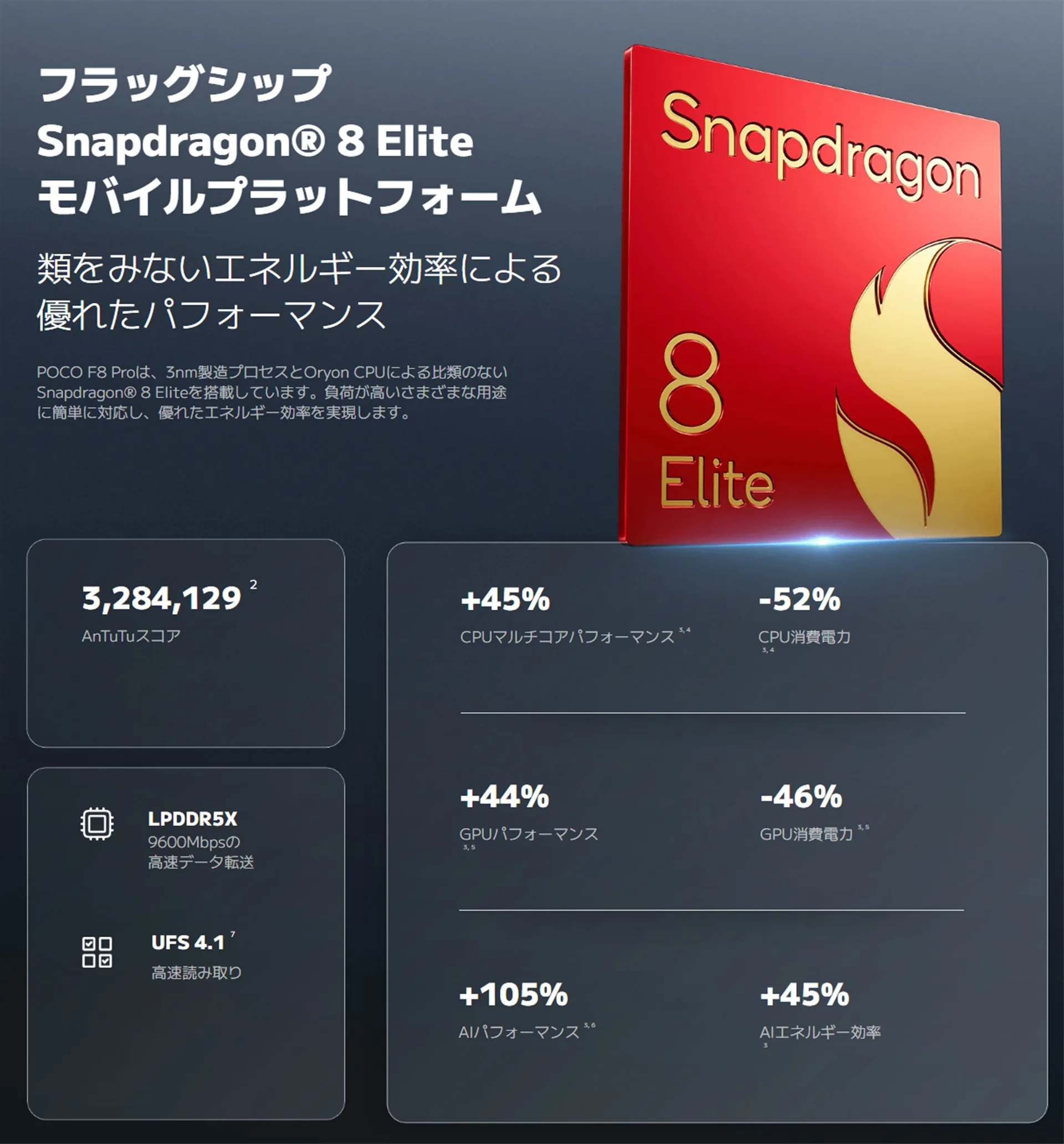 POCO F8 Proには、POCO F8 Ultraという兄貴分がおり、そちらはSnapdragon8 Elite Gen5搭載でこれが真のフラッグシップ。日本にはF8 Ultraが来なかったわけですが、それでもF8 ProはSnapdragon8 Elite搭載ですから、十分ハイエンド性能です。