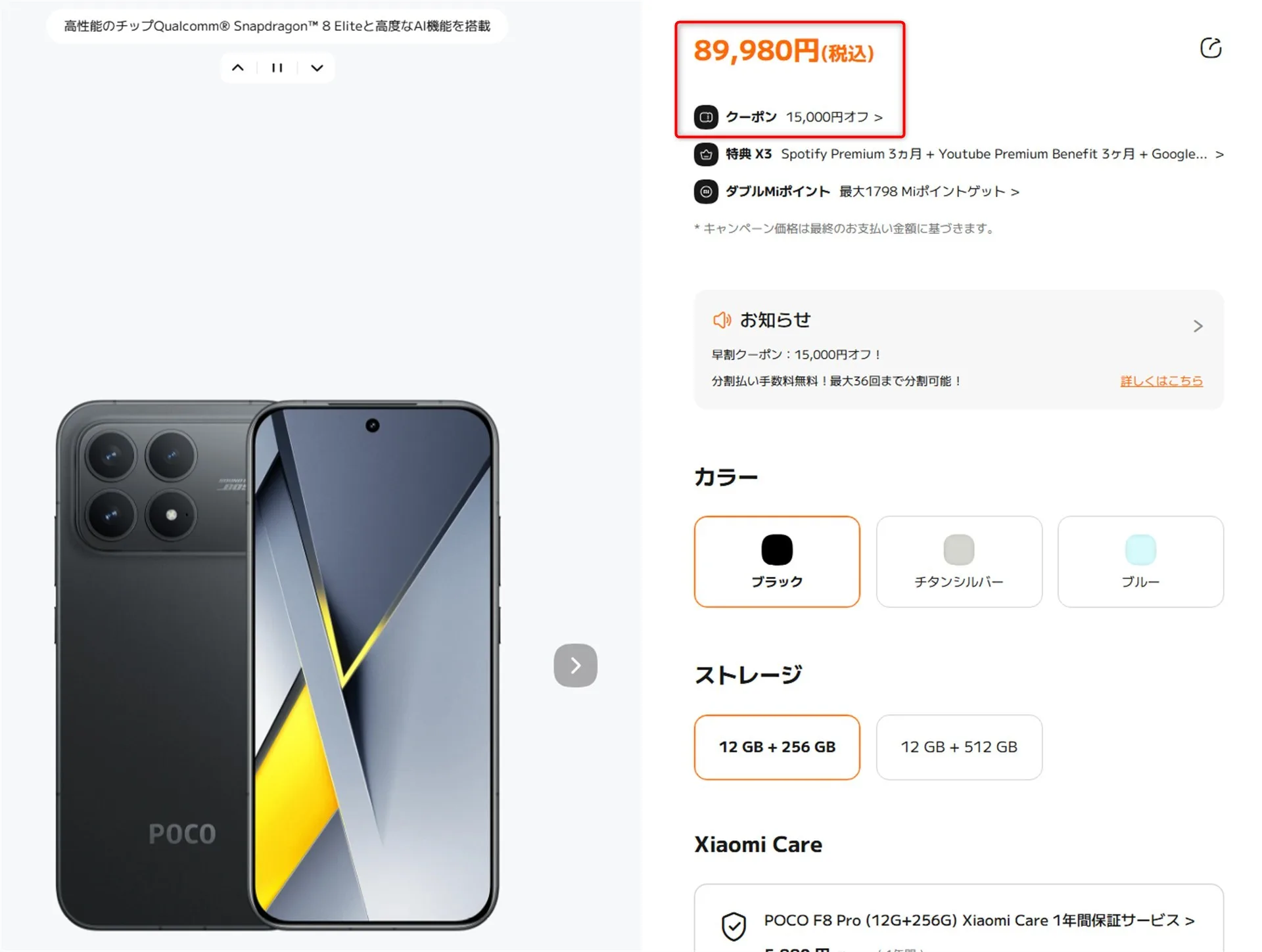 POCO F8 Proは日本でも発売され、12GB+256GB版が発売価格は89,980円とハイエンドモデルですが、9万円割れ。