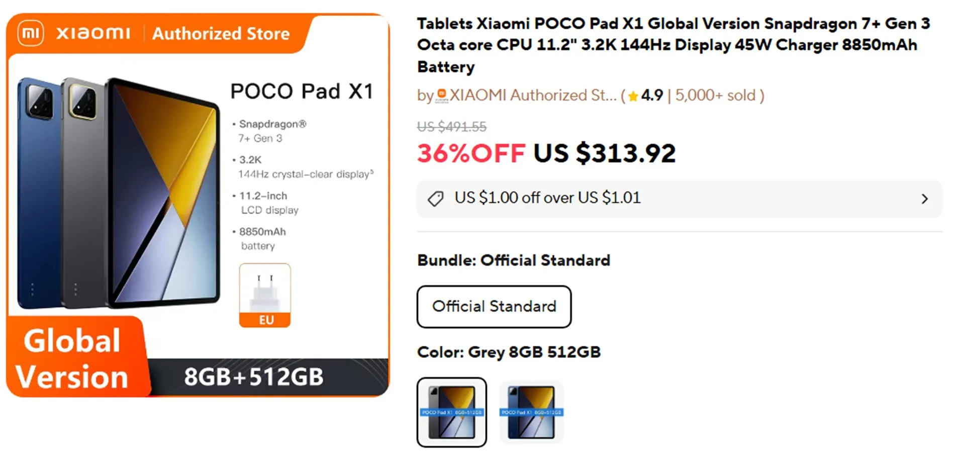 POCO Pad X1 8GB+512GB版のグローバルバージョンは、313.92ドル(約5万0