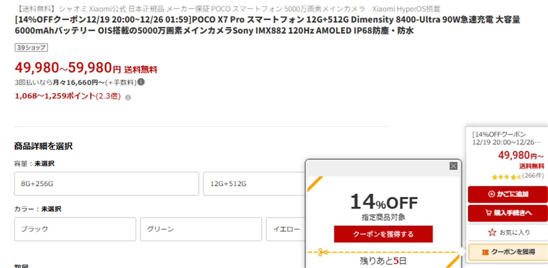 POCO X7 Proの8GB+256GB版は、49,980円が定価です。