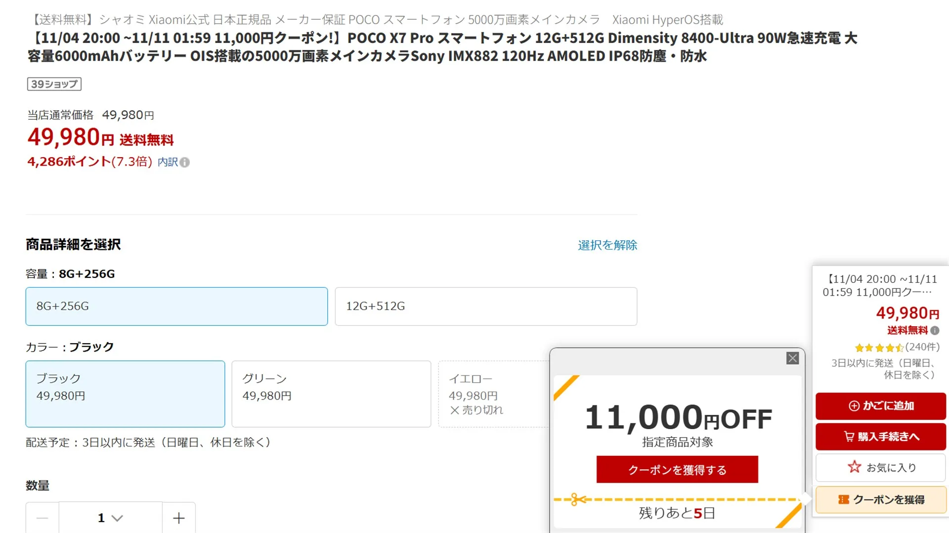 POCO X7 Proの8GB+256GB版は、49,980円が売り値です。