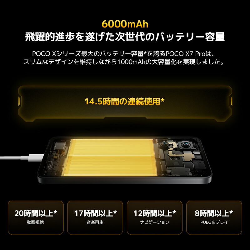 バッテリーには、6000mAhの大容量なバッテリーを搭載。一般的なスマホが4000mAhとしたら、1.5倍の容量になります。