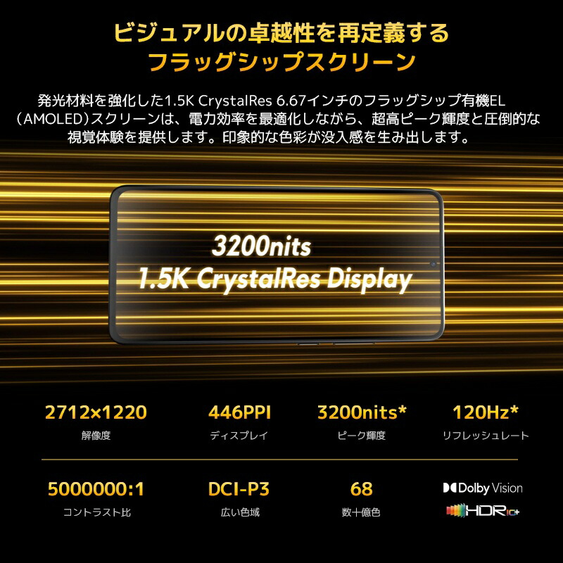 | ディスプレイ | 6.67インチ (2712×1220) AMOLEDディスプレイ リフレッシュレート 120Hz 最大輝度 3000nits |