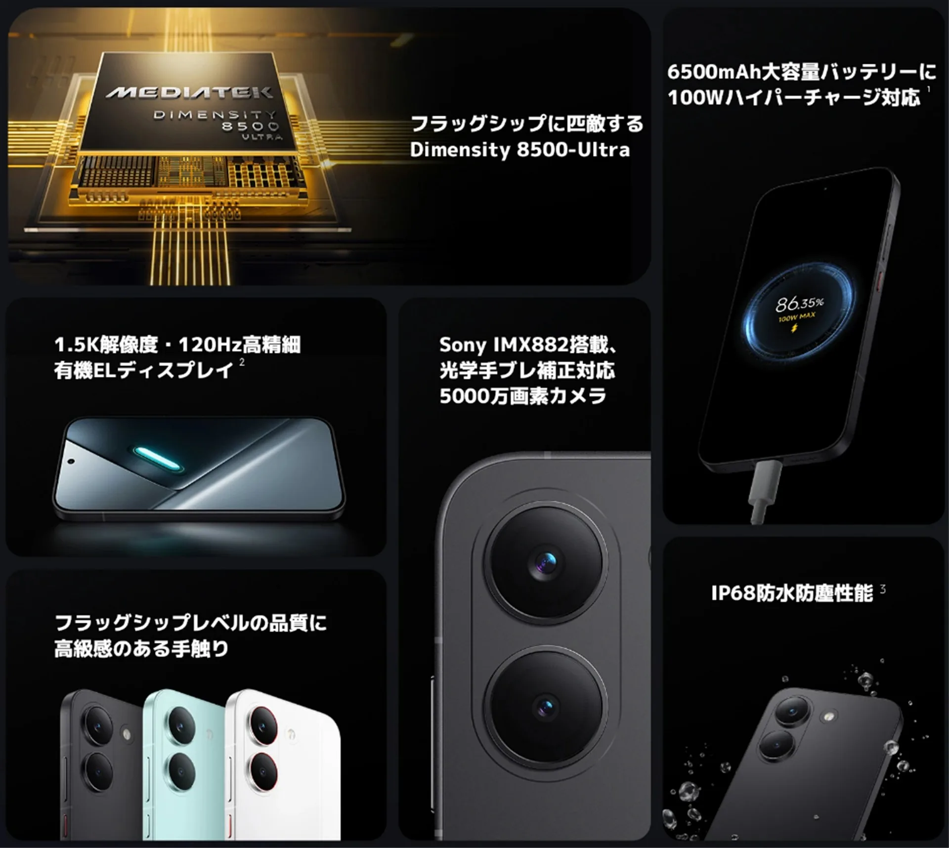 6.59インチの絶妙なサイズ感に、3500nitsの高輝度OLEDやOIS対応カメラ、6500mAhの大容量バッテリーと100W急速充電を詰め込んで、それでいて価格が実売5万円。
