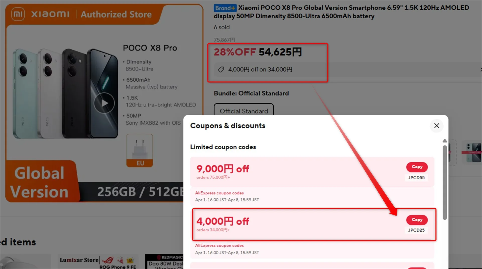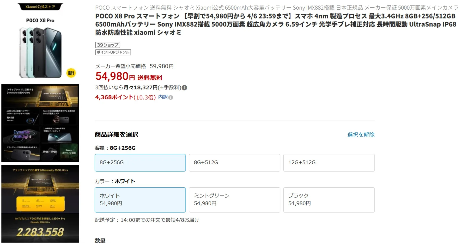 POCO X8 Proは、59,980円が定価ですが、実売価格は54,980円と発売記念で5000円引き中。