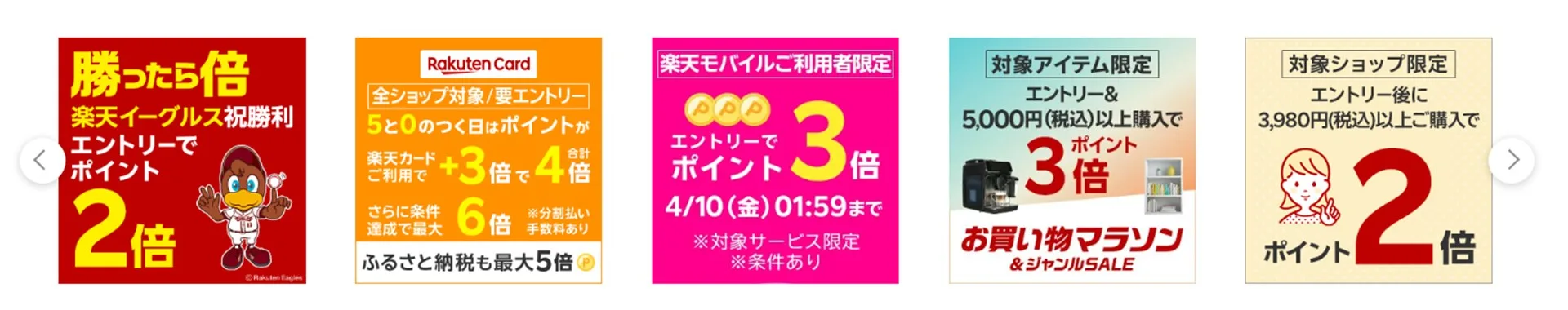 そして更に、楽天の場合以下のように、楽天イーグルス、またヴィッセル神戸が勝てば+2倍、5と0のつく日、楽天モバイルの人がエントリーすると3倍、39ショップ(3900円以上購入で送料無料ショップ)でポイント2倍等があり、それぞれ全てにポイント還元がある為、これらをかき集めると結構なポイント還元になります。