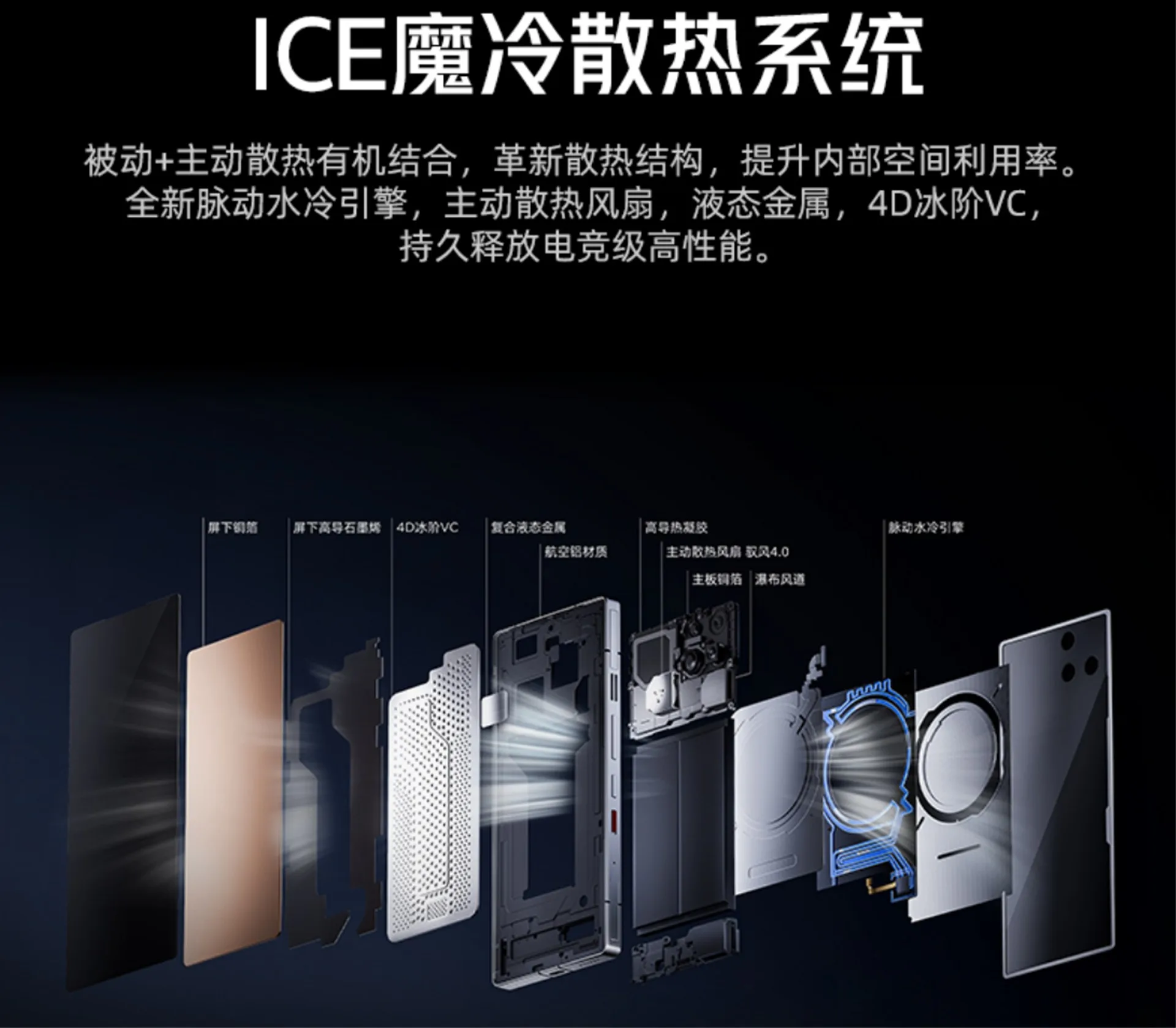 冷却システムは「ICE 魔冷散热系统」に加え、世界初とされる「红魔颤动水冷引擎 4.0 (振動型水冷エンジン)」を搭載。これは複合液体金属やアクティブ冷却ファンと組み合わさり、プロセッサの熱を排出し、長時間の高負荷でもパフォーマンスを持続させます。