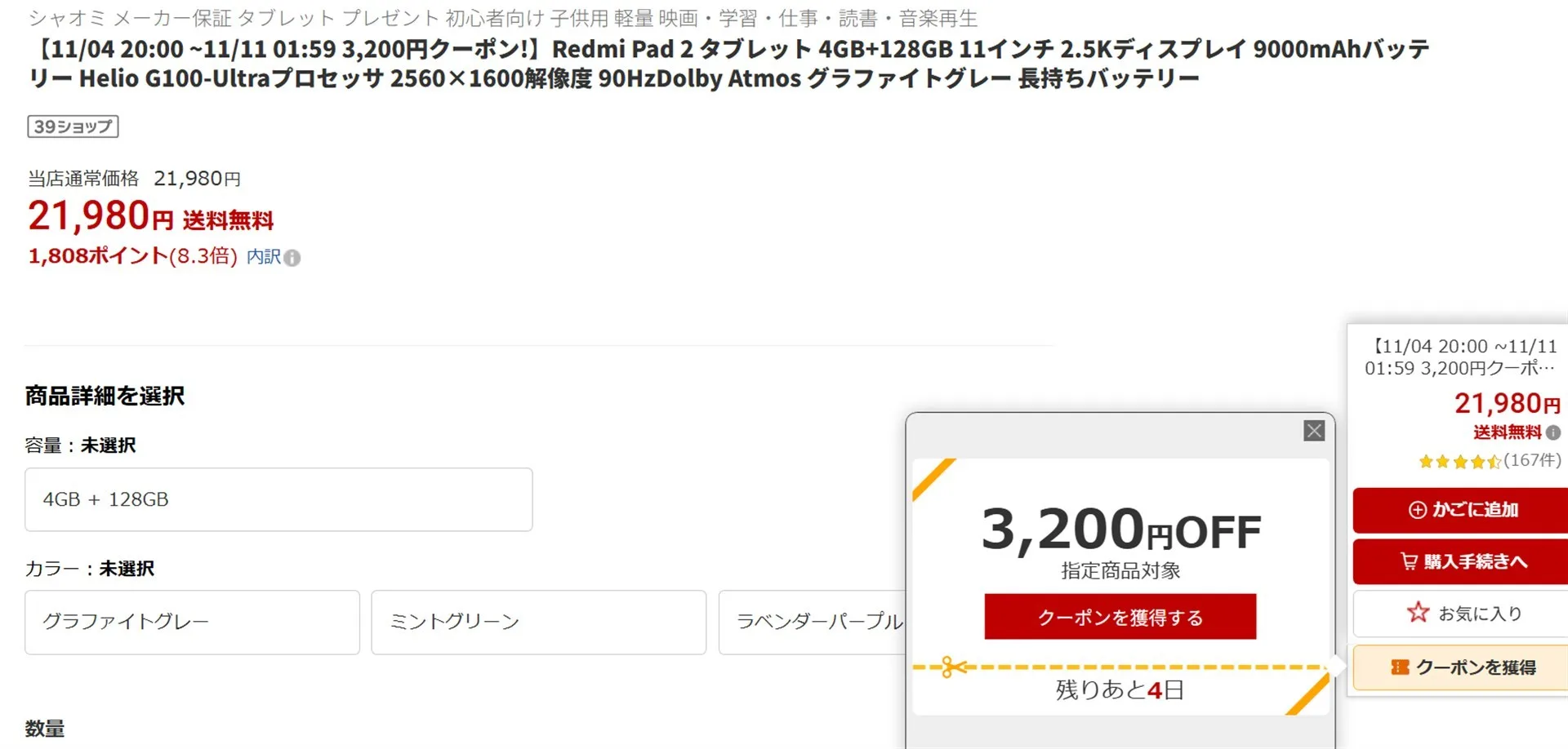 Redmi Pad 2の4GB+128GB版は、21,980円で販売中。
