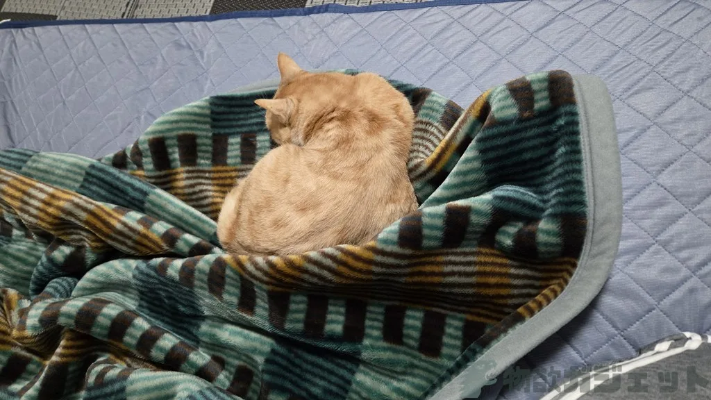 AM 4:00。起きたらまだ一緒に寝てた。にゃんこが真ん中近くにいるので、私が布団から落ちて寝てました。