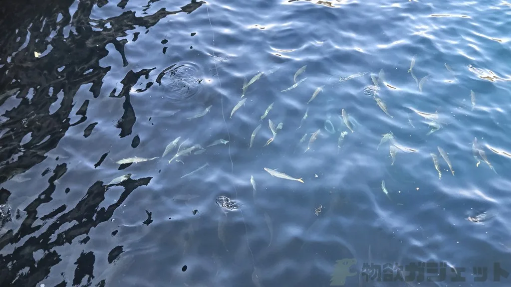 しかしムロアジはつなかなか釣れない。普通こんな数のムロアジが居れば、サビキ落としたら1投で2-3匹釣れるレベル。だが釣れない。