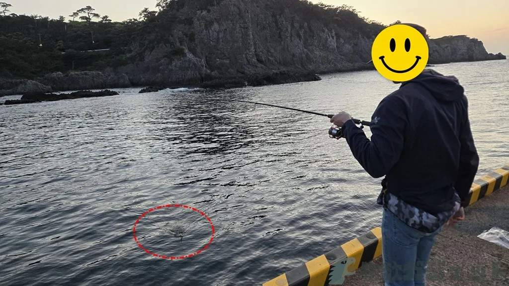 すかさずライトショアジギロッド(カンパチ等の青物釣り用)に、小さいメタルジグを付けて、小魚の群れの下でしゃくってみる。