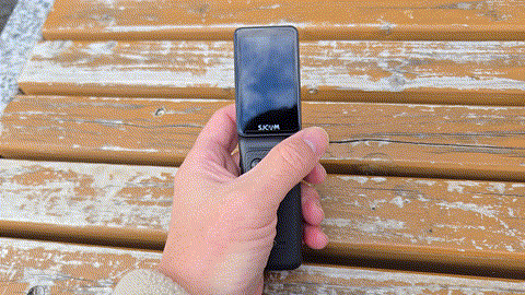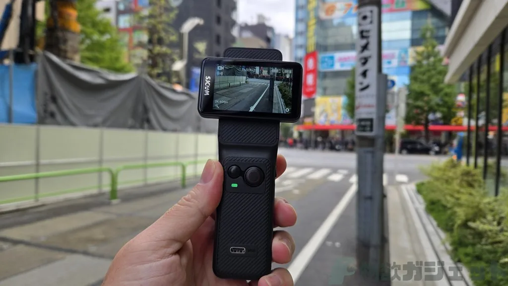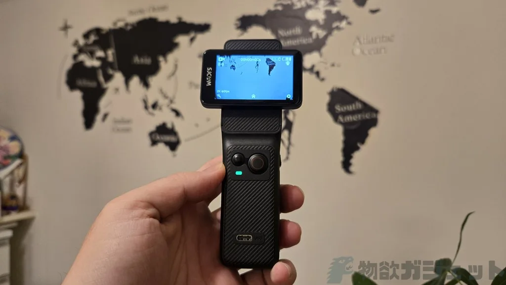 本体側のコントローラー部は左側は電源ボタンとなっています。右側の録画ボタンを押すだけで撮影でき、親指一つで撮影可能。設定等はタッチパネルから行うか、SJCAMアプリからも設定可能。