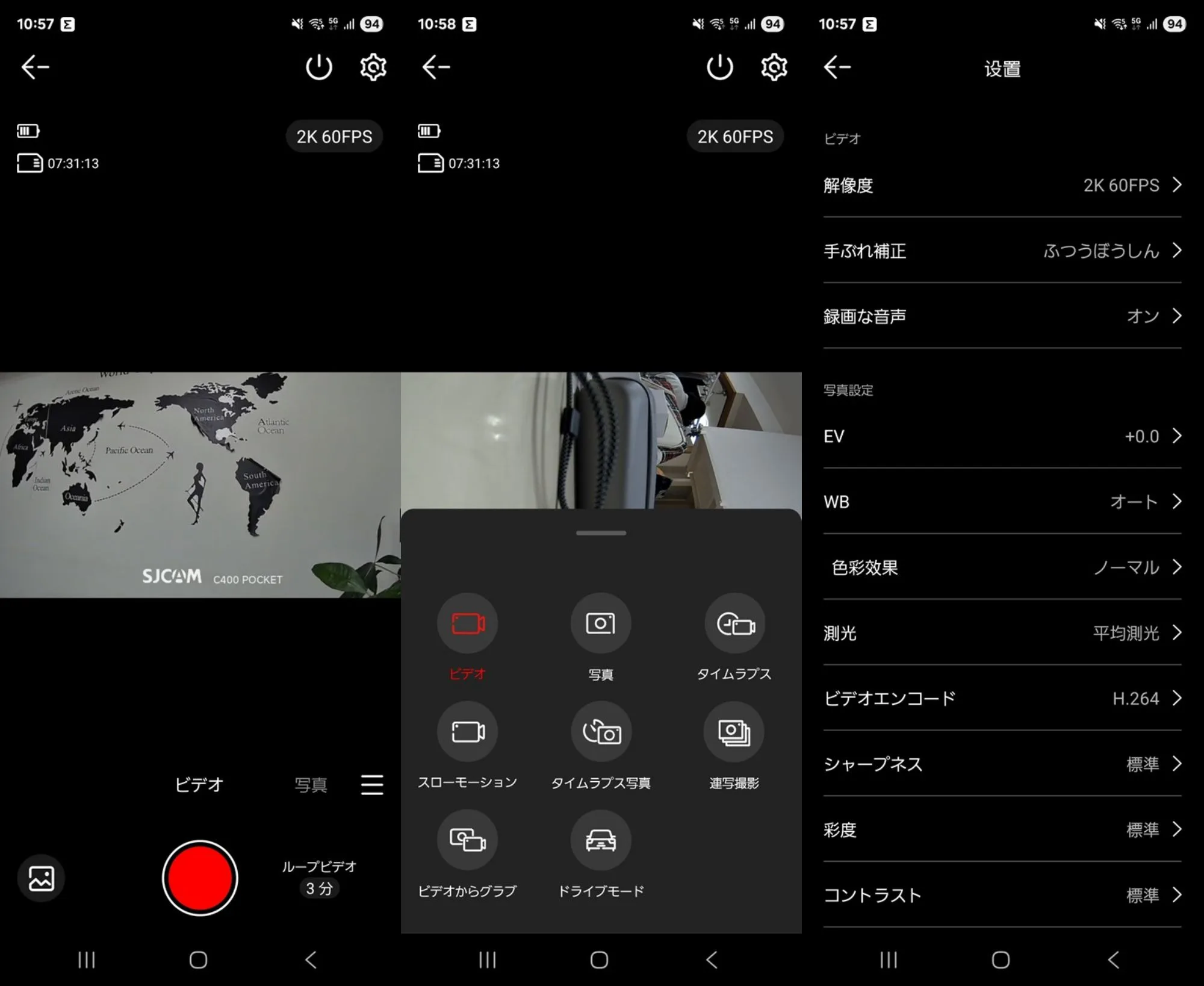 アプリは以下のような画面となり、シャッター/撮影ボタンや、撮影解像度、撮影モード、その他細かな手ぶれ補正モードやホワイトバランスなど、細かい設定変更も可能です。