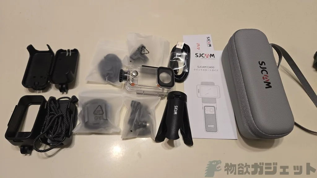 同梱品は多数。アタッチメント各種、防水ハウジング、三脚、USB Type-Cケーブル、マニュアル、キャリングケースです。