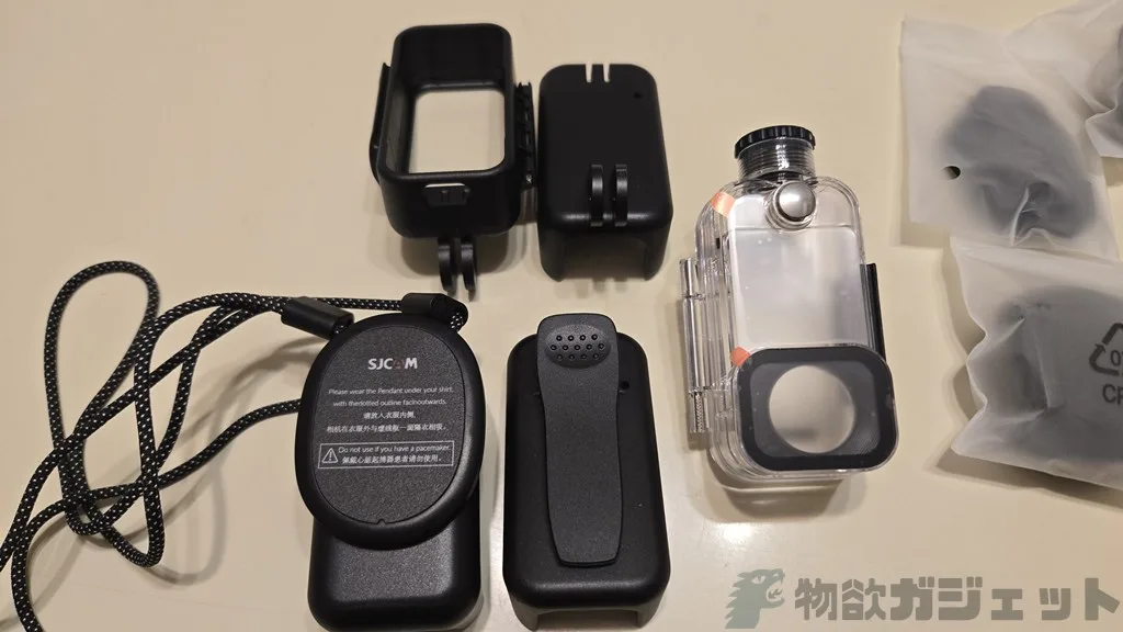 アタッチメントはGoPro互換のケースがあり、市販の様々なアタッチメントに対応できます。また左下はマグネットケースで、このアタッチメントにはめ込めば磁石が付くところには全て固定可能。右下はクリップ型ですね。