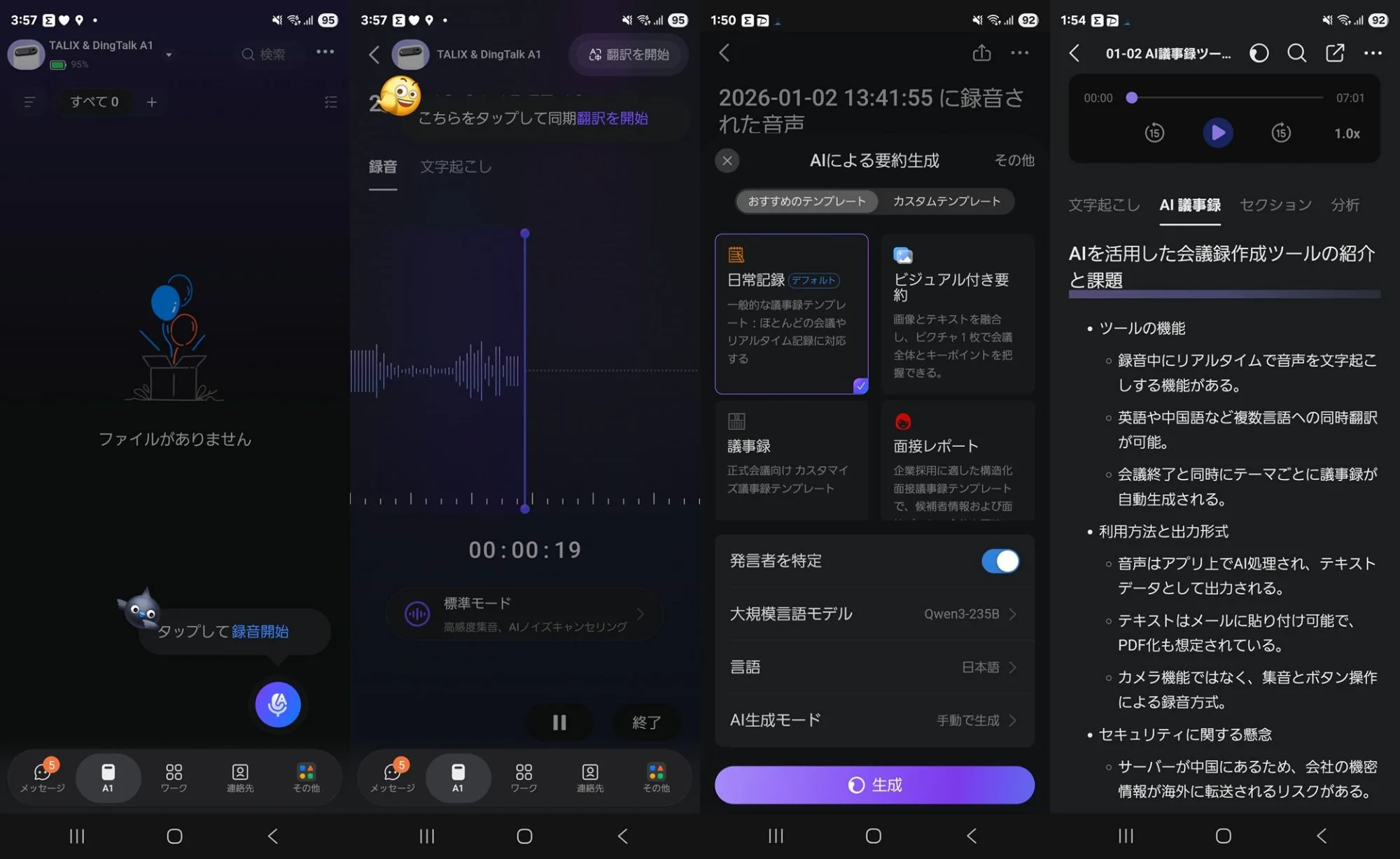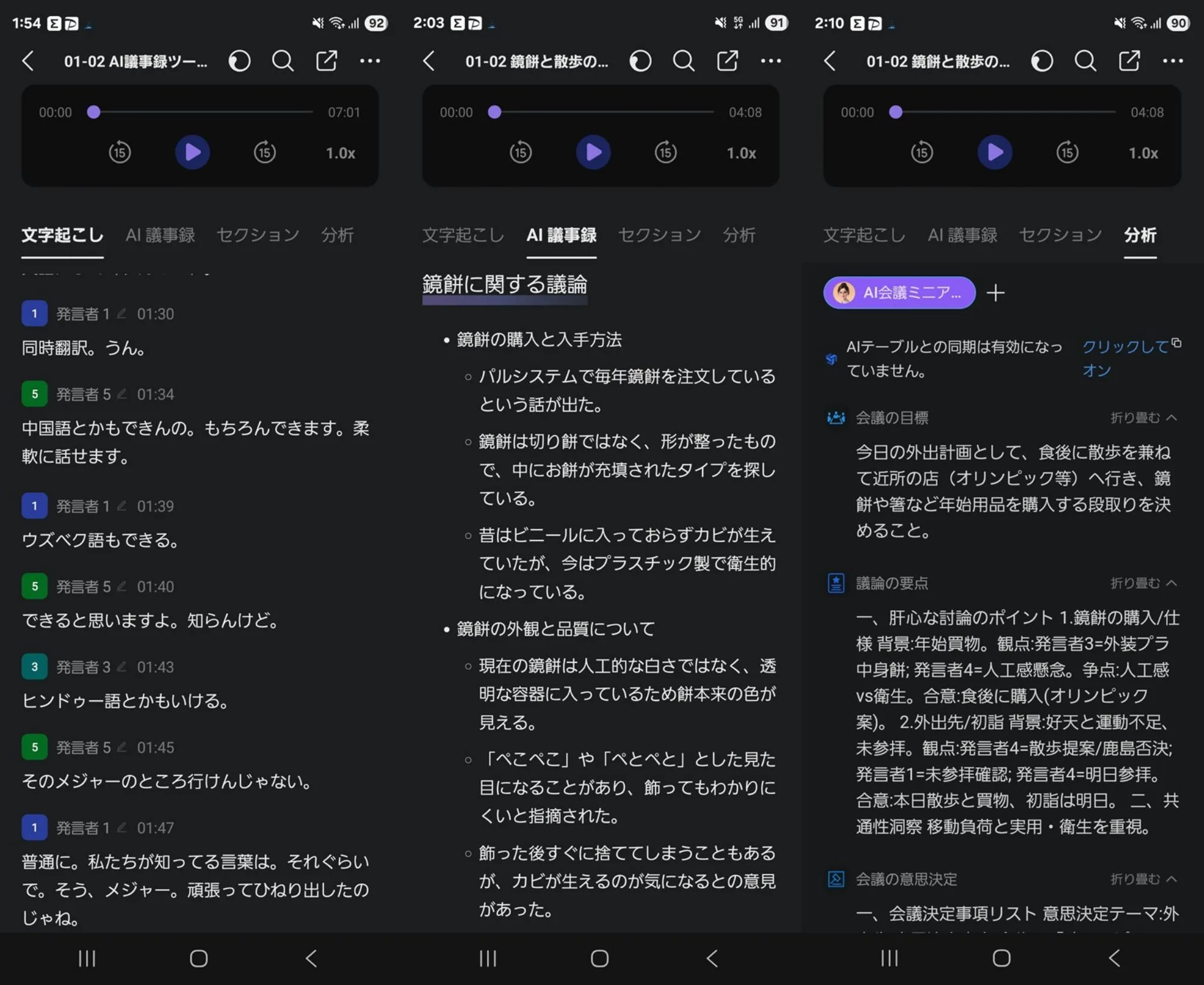 使い方は簡単で、基本的には録音さえしておけば後でAI処理で文字起こしから議事録作成、翻訳等を指示するだけ。翻訳は同時も可能です。