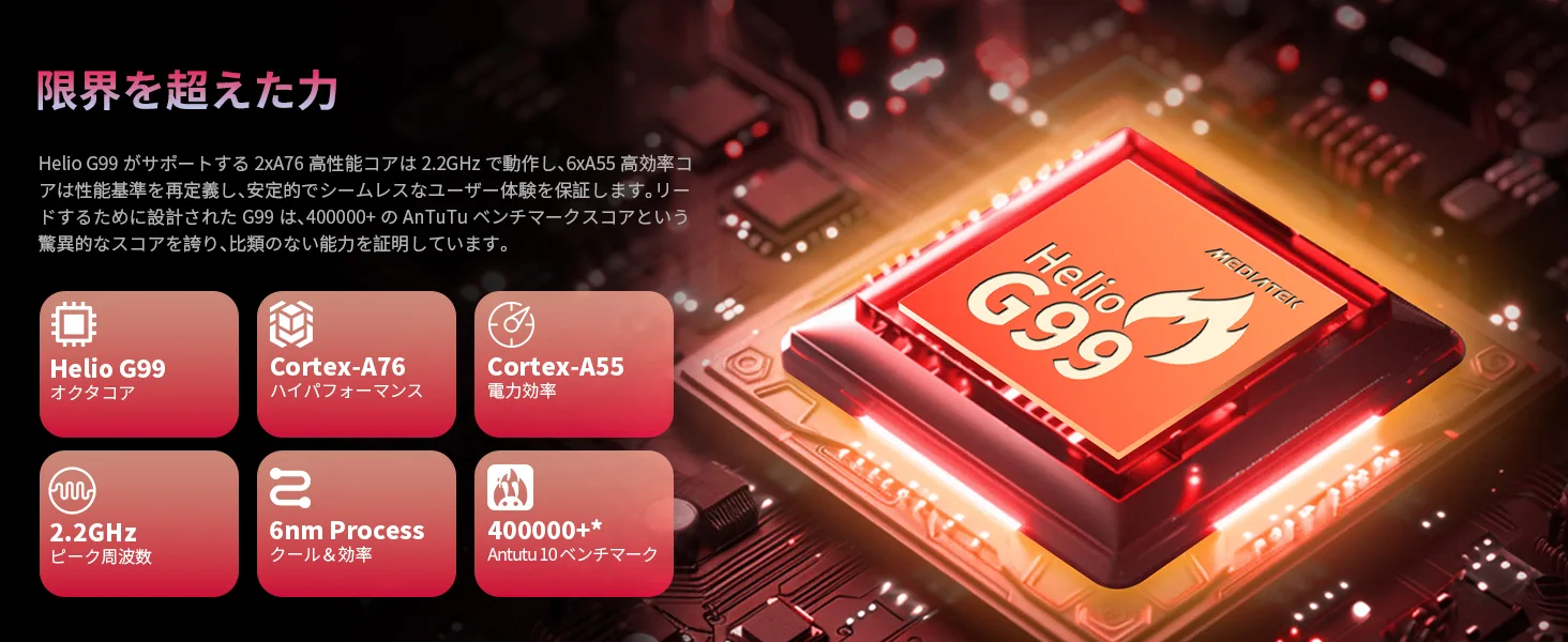 | プロセッサ (CPU) | MediaTek Helio G99 (オクタコア, 6nmプロセス) |