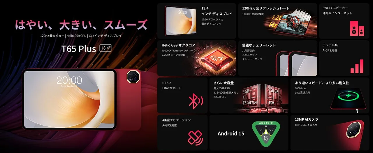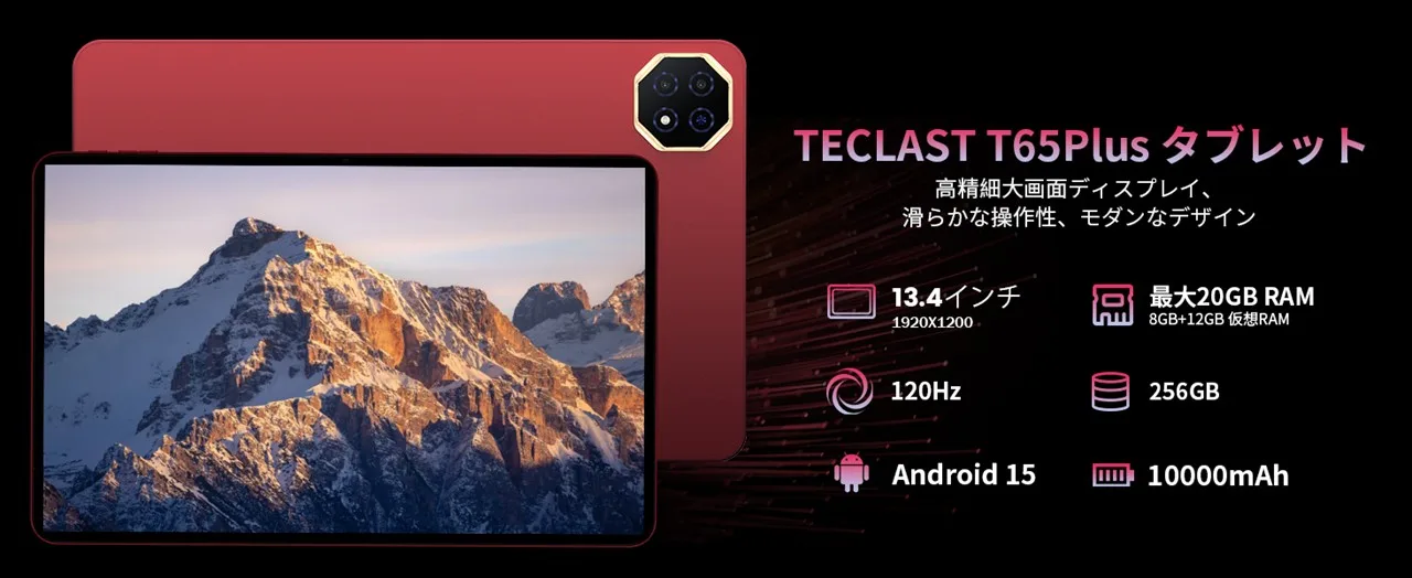 TECLASTから、MediatTek HelioG99搭載で13.4インチの特大Android15タブレット「TECLAST T65 Plus」が、Amazonで発売されていますが、セールとクーポンでました。