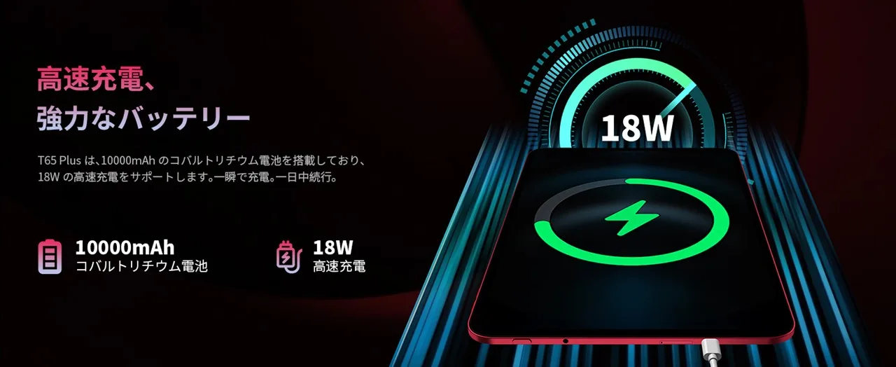 バッテリー容量は10000mAhと非常に大容量です。大型ディスプレイを搭載しているにもかかわらず、長時間の使用を可能にします。充電は18Wの急速充電に対応しており、大容量バッテリーでも比較的短時間での充電が可能です。