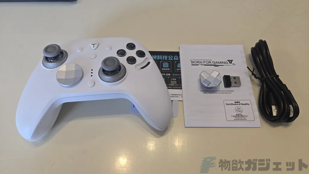 同梱物は、コントローラー、PC用USBドングル、USB Type-Cケーブル、交換用の十字キーとマニュアル。