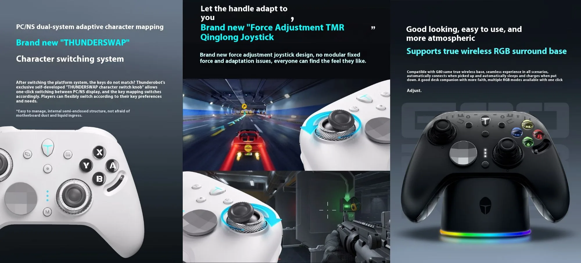 ThundeRobot G80TSは、カスタマイズ性を極めた多機能ワイヤレスコントローラー。PCや任天堂Switch、iOS、Androidに3モード(有線・2.4G・Bluetooth)で接続可能。
