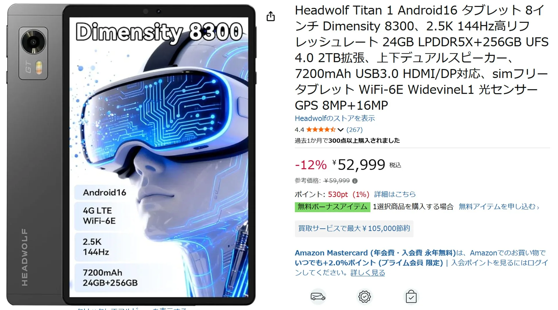 人気の8.8インチタブレット HEADWOLF Ttian1は定価59,999円ですが、7000円オフで52,999円となっています。