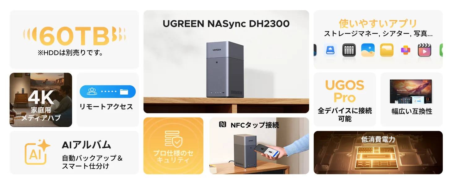DH2300は、NAS初心者に最適な最大60TBの大容量に対応した2ベイNASストレージです。
