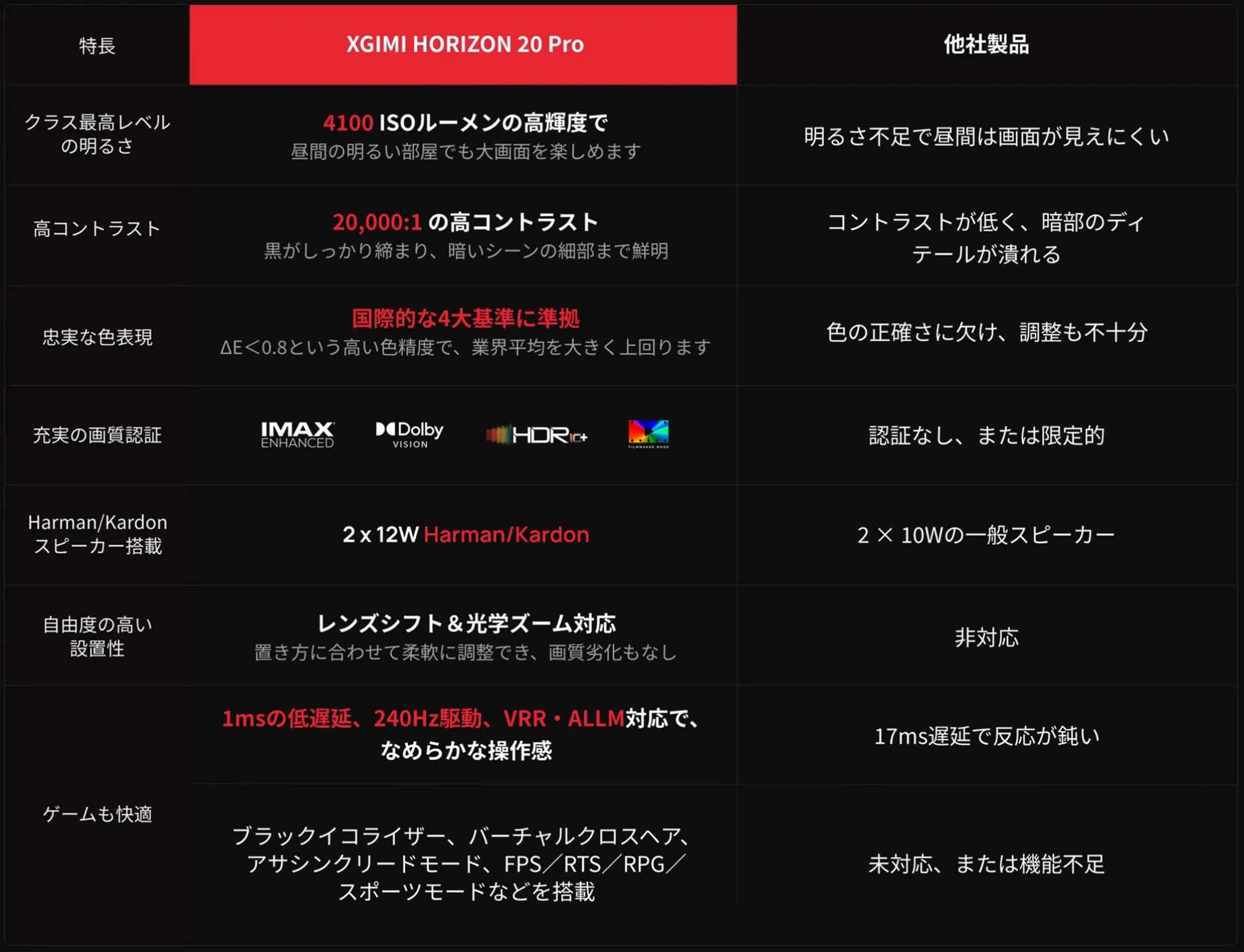 以下XGIMI HORIZON20シリーズの比較です。HORIZON 20 Proはスタンダードと呼ばれていますが価格的には30万円前後となっています。